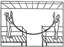 Заготовка и установка пробок; 10 мин; С1 и С2; топор, молоток, подмости, ножовка. Столяр С1 производит заготовку пробок. Столяр С2 забивает пробки молотком в высверленные отверстия. |