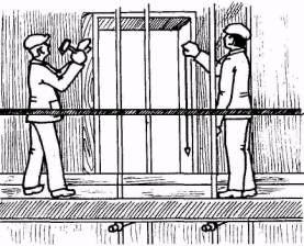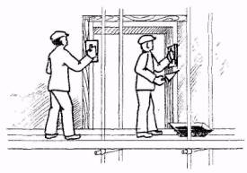 4. ТЕХНОЛОГИЯ ПРОЦЕССА И ОРГАНИЗАЦИЯ ТРУДА 4.1. Оштукатуриваемые поверхности очищаются от пыли, удаляются наплывы и другие дефекты. Производится разбивка поверхности на камни (согласно проекту) и определяется толщина намета по всему фасаду. Маяками при этом служат пояски оконных и дверных проемов. 4.2. Выверку вертикальных (боковых) откосов оконных проемов и деревянных реек под русты производят путем провешивания их при помощи 400-600-граммового отвеса, опушенного через все этажи от окна верхнего этажа. Для выверки горизонтальных откосов, сливов и деревянных реек натягивают шнур по линиям их граней вдоль фасада. 4.3. Операции по устройству откосов и прибивку деревянных реек для рустов выполняют в следующем порядке: устанавливают направляющие рейки по правилу с отвесом, набрасывают раствор кельмой и разравнивают его при помощи полутерков и терок. Рейки для образования рустов крепятся гвоздями в швы кладки. До прибивки деревянных реек их необходимо замочить в воде для облегчения снятия после выполнения терразитовой штукатурки. Форма реек трапецеидальная. С фасадной стороны шесте с откосом выполняют поясок шириной 40 мм, служащий маяком как для прибивки деревянных реек под русты, так и для выполнения терразитовой штукатурки. 4.4. Организация рабочего места