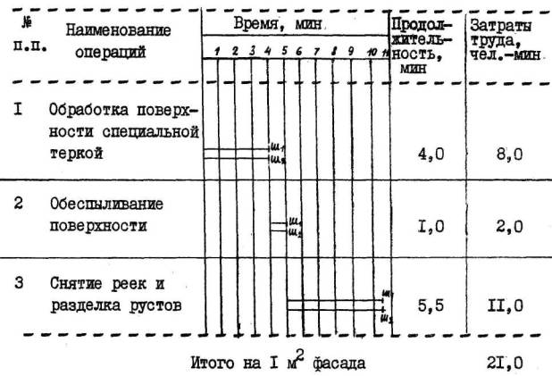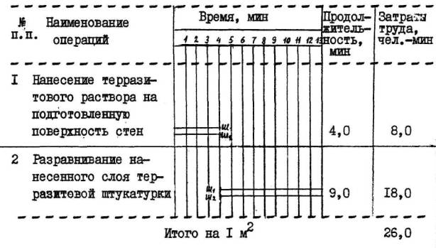 Примечание. В затраты труда включено время на подготовительно-заключительные работы (4%) и отдых (12%), Снижение затрат труда и повышение выработки рабочих достигается за счет механизированного нанесения слоев терразитовой штукатурки без устройства подготовительного слоя-штукатурки и сокращения численного состава звена штукатуров по сравнению с ЕНиР. 2. УСЛОВИЯ И ПОДГОТОВКА ВЫПОЛНЕНИЯ ПРОЦЕССА 2.1. До начала работ необходимо: - подготовить основание - промаячить и оштукатурить откосы и пояски проемов; - разметить и прибить деревянные рейки под русты; - приготовить терразитовый раствор; - доставить на рабочее место инструменты и материалы. 2.2. Работы следует выполнять соблюдая правила техники безопасности и охраны труда рабочих в соответствии со СНиП III-A.II-70 § 17. 2.3. Режим труда и отдыха определен из условия оптимально высокого темпа выполнения трудовых процессов в соответствии с "Основами методики технического нормирования труда в строительстве", выпуск 1, приложения 2 и 3. 3. ИСПОЛНИТЕЛИ, ПРЕДМЕТЫ И ОРУДИЯ ТРУДА 3.1. Исполнители: Штукатур V разряда (Ш1) - 1 Штукатур III разряда (Ш2) - 1 3.2. Инструменты, приспособления и инвентарь