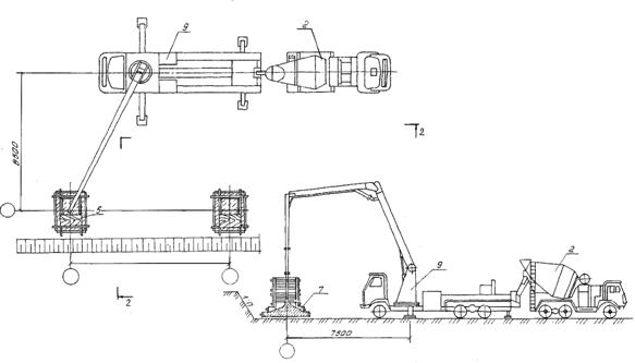 1 - кран автомобильный СМК-10; 2 - автобетоносмеситель СБ159; 3 - бункер