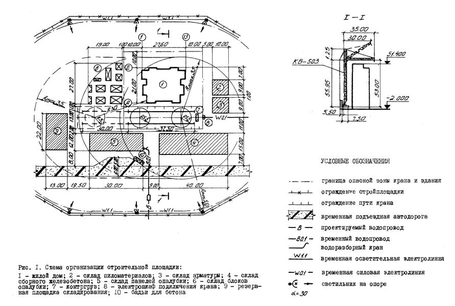 расчета на типовой этаж: высота этажа В состав работ, рассматриваемых картой, входят: укладка бетонной смеси в конструкцию; уплотнение бетонной смеси; уход за бетоном. Работы предусмотрено вести в две смены. 2. ОРГАНИЗАЦИЯ И ТЕХНОЛОГИЯ ВЫПОЛНЕНИЯ РАБОТДо начала бетонирования на захватке должны быть выполнены следующие работы: установлены вся арматура и закладные детали; смонтированы все элементы опалубки; проверена правильность установки и надежность крепления элементов опалубки; проверено наличие смазки на щитах; увлажнена поверхность стен нижележащего этажа; подготовлены инструменты и инвентарь. Схема организации строительной площадки (с площадками складирования и местом установки монтажного крана) показана на рис.1, стр. 6. Стены бетонируются с помощью башенного крана КБ-503 грузоподъемностью 10 т. Бетонная смесь к месту