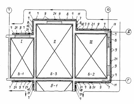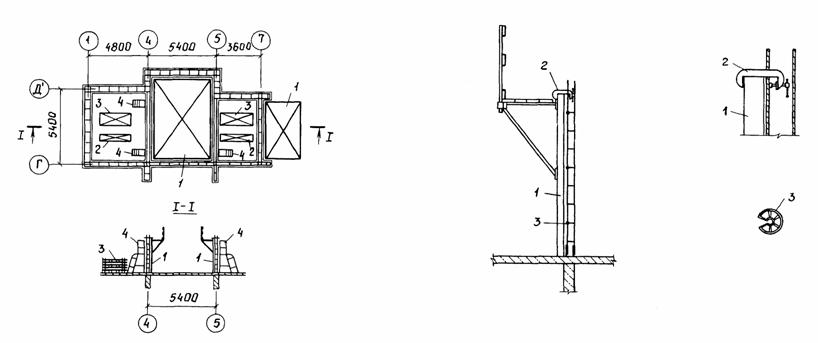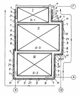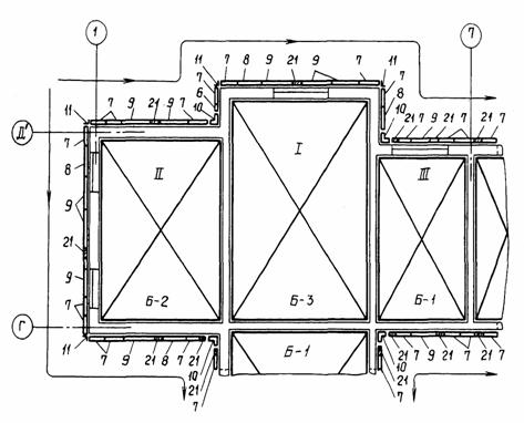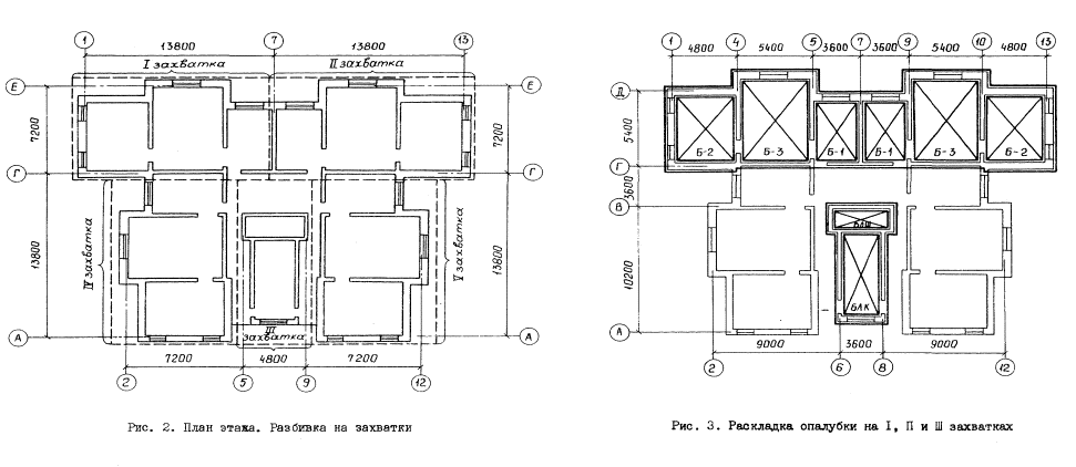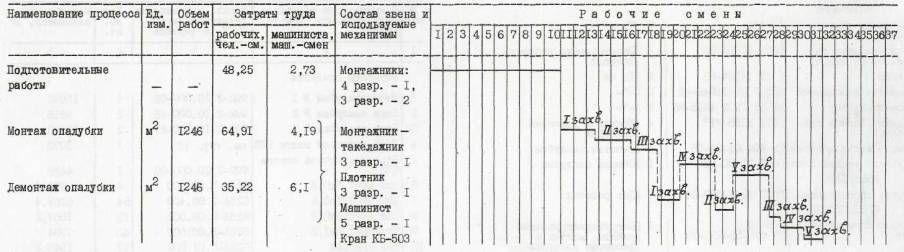 СОДЕРЖАНИЕ I. МОНТАЖ И ДЕМОНТАЖ ОПАЛУБКИ БЛОЧНОЙ И КРУПНОЩИТОВОЙ ДЛЯ ВОЗВЕДЕНИЯ СТЕН ЖИЛЫХ ДОМОВ С НАРУЖНЫМИ И ВНУТРЕННИМИ СТЕНАМИ ИЗ МОНОЛИТНОГО БЕТОНА1. ОБЛАСТЬ ПРИМЕНЕНИЯТехнологическая карта предусматривает монтаж и демонтаж блочной опалубки (РЧ 992-2.00.000) и крупнощитовой опалубки (РЧ 625А-2.00.000), разработанной ЦНИИОМТП Госстроя СССР. За основу разработка технологической карты принят проект 16-этажного экспериментального жилого дома в г. Вильнюсе. Объем работ принят из расчета на типовой этаж: высота этажа 2,88 м; толщина внутренних стен 24 см, наружных стен - 36 см; перекрытия сборные толщиной 22 см. В технологической карте рассматривается монтаж и демонтаж блоков опалубки, щитов опалубки наружных и внутренних стен (возможен вариант сборки укрупненных панелей), угловых щитов, щитов-компенсаторов и проемообразователей (разработка ЭПСО "Монолит" Минстроя ЛитССР). Площадь опалубливаемой поверхности - 1246 м2. Объем бетона - 203 м3. Работа ведутся в летний период в одну смену. При привязке технологической карты к конкретному объекту и условиям строительства уточняется состав и объемы работ, калькуляция затрат труда, средства механизации, потребность в материально-технических ресурсах, графическая схема организации строительства. 2. ОРГАНИЗАЦИЯ И ТЕХНОЛОГИЯ ВЫПОЛНЕНИЯ РАБОТДо начала работ по монтажу опалубки должны бить выполнены организационно-подготовительные мероприятия в соответствии со СНиП 3.01.01-85 "Организация строительного производства". В том числе необходимо: возвести основание (плиту перекрытия) и сдать его по акту; выполнить армирование стен и сдать арматуру по акту; проверить комплектность и техническое состояние элементов опалубки, приспособлений и инструментов, наличие необходимых материалов для устройства настила. Подача элементов опалубки в рабочую зону производится краном. Блоки опалубки подают в собранном состоянии, щиты опалубки - поштучно, а при варианте сборки укрупненными панелями - в собранном состоянии. Детали и мелкие сборочные единицы подают в ларях для закладных деталей. Схема организации строительной площадки (с площадками складирования и местом установки монтажного крана) показана на рис. 1. Собранные на монтажной площадке блоки и панели опалубки складируются в зоне действия монтажного крана в постоянном месте. Максимальные размеры блока 7,2 × 5,4 м в осях стен. Максимальная длина отдельной укрупненной панели 6,48 м. Монтаж элементов опалубки выполняется башенным краном КБ-503. Техническая характеристика монтажного крана Марка КБ-503 Грузоподъемность, т: максимальная 10 минимальная 7,5 Вылет стрелы, м: максимальный 35 минимальный 7,5 Высота подъема крюка, м: максимальная 67 минимальная 53 Строповка элементов опалубки производится четырехветвевым стропом 4CK-10. Для поточного производства работ по монтажу опалубки каждый этаж здания в плане разбит на пять захваток (рис. 2). Необходимый комплект опалубки обеспечивает одновременную работу на I, II и III (лифтовая шахта и лестничная клетка) захватках (рис. 3). Опалубка с I-й захватки переставляется на IV-ю захватку, а со II-й - на V-ю захватку (рис. 4). Опалубка с III-й захватки (лифтовая шахта и лестничная клетка) опускается на площадку складирования и монтируется на следующем этаже. Рабочие швы между захватками устраиваются с помощью сетки "Рабица", привязываемой к арматуре вязаль