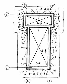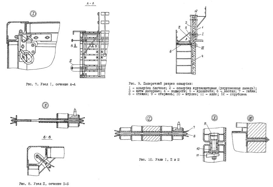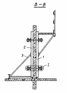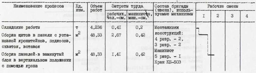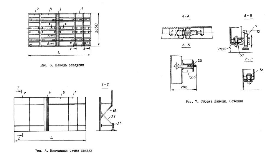 II. ПРЕДВАРИТЕЛЬНАЯ СБОРКА ЗАМКНУТОЙ СЕКЦИИ БЛОЧНОЙ ОПАЛУБКИ (РЧ 992-2.10.000-03)1. ОБЛАСТЬ ПРИМЕНЕНИЯТехнологическая карта разработана на предварительную сборку на монтажной площадке замкнутой секции блочной опалубки конструкции ЦНИИОМТП Госстроя СССР (проект 992-2.00.000), используемой при возведении монолитных железобетонных стен жилых домов по типу 16-этажного экспериментального жилого дома в г. Вильнюсе. Площадь опалубливаемой поверхности блока опалубки размером в плане 3600×5400 мм, высотой 2660 мм - 48 м2. В состав работ, предусмотренных картой, входят: укрупнительная сборка панелей 992-2.11.000 и 992-2.11.000-03 из модульных унифицированных щитов; сборка замкнутой секции блочной опалубки 992-2.10.000-03 из панелей и угловых вставок. Работы ведутся в летний период в одну смену. 2. ОРГАНИЗАЦИЯ И ТЕХНОЛОГИЯ ВЫПОЛНЕНИЯ РАБОТДо начала предварительной сборки замкнутой секции блочной опалубки необходимо выполнить следующие организационно-подготовительные мероприятия: организовать площадку складирования элементов опалубки в зоне действия крана со складированием элементов опалубки и материалов, необходимых для технологических операций, уложенных по маркам и типоразмерам; подготовить основание монтажной площадки; проверить комплектность и техническое состояние элементов опалубки, приспособлений и инструментов, наличие необходимых материалов для устройства настила; произвести разметку монтажной площадки (краской) по размерам собираемого блока в плане. Подача элементов опалубки собираемого блока на монтажную площадку осуществляется башенным краном КБ-503 со следующими техническими характеристиками: Грузоподъемность, т: максимальная 10 минимальная 7,5 Вылет стрелы, м: максимальный 35 минимальный 7,5 Высота подъема крюка, м: максимальная 67 минимальная 53 Монтаж опалубки блочной производится в следующем порядке: из унифицированных щитов собирают панели; на монтажной площадке с помощью крана устанавливаются панели с опиранием на монтажные кронштейны; с помощью домкратов выверяется вертикальность установки панелей; на схватке несущей панели устанавливаются и закрепляются нижние и верхние кронштейны; угловая вставка устанавливается е помощью крана и раскрепляется с помощью прижима и натяжного крюка; аналогично устанавливаются остальные панели блока и собираются углы; выверяется сборка блока, производится его раскрепление. До начала сборки блока опалубки (замкнутой секции) комплект элементов опалубки раскладывается на монтажной площадке. На монтажной площадке производится разметка габаритов монтируемого блока. Предварительно из унифицированных щитов и щитов-компенсаторов (поз. 1÷4, рис. 1) собирают панели и с помощью крана укладывают их на подкладочные доски. Щиты укладывают палубой вниз. Щиты при сборке в панели соединяются между собой при помощи пары "винт-гайка" (сеч. А-А, рис. 7) и объединяются при помощи схваток (поз. 5, 6, сеч. Е-Е, рис. 4 и сеч. Б-Б, рис. 7) в двух ярусах по высоте. Схватки крепятся на щиты опалубки при помощи крюков натяжных (поз. 23, сеч. Б-Б, рис. 7). По нижней части панели при помощи болтовых соединений крепятся вставки (поз. 28, 29, сеч. Г-Г, рис. 7) и устанавливаются по два домкрата (поз. 7, сеч. В-В, рис. 7) на каждую собираемую панель. На каркасы щитов панели навешиваются кронштейны со стойками (поз. 16, 17, рис. 1). Кронштейны служат основанием для рабоч