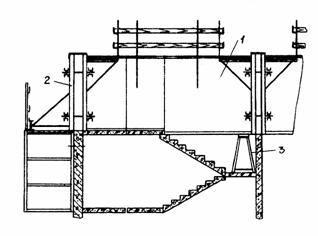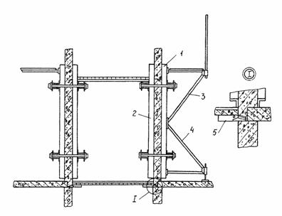 Демонтаж блочной опалубки производится в следующем порядке: отвертываются и вынимаются стяжки; ослабляются гайки натяжных крюков угловых вставок; поворотом гаек натяжных крюков производится отрыв угловых вставок и подтягивание их к щитам; блок стропится за монтажные петли верхних зажимов и с помощью крана переносится либо на следующую захватку, либо на площадку складирования; перед установкой блока в проектное положение на новую захватку щиты и угловые вставки очищают от налипшего бетона и покрывают смазкой. До монтажа щитов (укрупненных панелей) опалубки наружных стен производится навеска подмостей. Подмости навешиваются на балку, которая крепится болтами, устанавливаемыми в отверстия от стяжек в наружных стенах предыдущего этажа (см. рис. 10, узел III). Схема установки подмостей по захваткам дана на рис. 20. Монтаж щитов (укрупненных панелей) опалубки наружных стен производится в следующем порядке: падуба щита (панели) смазывается с помощью краскопульта; щит (панель) стропят и устанавливают на рабочее место (подмости); раскрепляют щиты (панели) опалубки наружных стен с блоками опалубки при помощи стяжек; регулируется вертикальность установки щитов (панелей) при помощи подкосов; наружные углы опалубки формируются путем соединения взаимно; перпендикулярных щитов (панелей) через монтажные уголки; внутренние углы опалубки формируются путем соединения взаимно перпендикулярных щитов (панелей) через щиты угловые; по верху щиты (панели) опалубки соединяются с блочной опалубкой при помощи струбцин. Опалубка лифтовой шахты формируется в блок из типовых элементов крупнощитовой опалубки и устанавливается на опорное днище лифтовой шахты. Опалубка лестничной клетки формируется из типовых элементов блочной опалубки с опиранием с одной стороны на лестничную площадку, с другой стороны - на подставки. Работы по монтажу и демонтажу опалубки выполняются звеном из 5 человек: монтажник IV разряда - 1; монтажник III разряда - 2; монтажник-такелажник III разряда - 1; плотник III разряда - 1. 3. ТРЕБОВАНИЯ К КАЧЕСТВУ И ПРИЕМКЕ РАБОТОперационный контроль качества работ по монтажу и демонтажу опалубки выполняется в соответствии с требованиями главы 7 СНиП 3.01.01-85 "Организация строительного производства" и приводится в табл. 1. Отклонения в размерах и положении элементов опалубки не должны превышать допусков, указанных в СНиП 3.03.01-87 "Несущие и ограждающие конструкции".