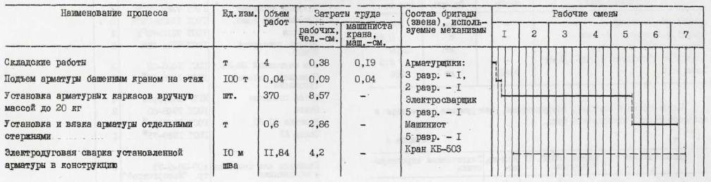 монтаж III. АРМИРОВАНИЕ НАРУЖНЫХ И ВНУТРЕННИХ СТЕН ТИПОВОГО ЭТАЖА1. ОБЛАСТЬ ПРИМЕНЕНИЯТехнологическая карта разработана на монтаж арматуры наружных и внутренних стен при возведении 16-этажного экспериментального жилого дома в г. Вильнюсе из монолитного бетона с применением блочно-щитовой опалубки. Высота этажа - Работа выполняются с помощью башенного крана КБ-503 (см. рис. 1., стр. 6). В состав работ, рассматриваемых картой, входит армирование стен. Работы выполняются в летний период в одну смену. При привязке технологической карты к конкретному объекту и условиям строительства уточняются калькуляция затрат труда, средства механизации, потребность в материально-технических ресурсах, графическая схема организации строительства. 2. ОРГАНИЗАЦИЯ И ТЕХНОЛОГИЯ ВЫПОЛНЕНИЯ РАБОТДо начала монтажа арматуры внутренних и наружных стен должны быть выполнены следующие работы: смонтированы плиты перекрытия; нанесены риски разбивочных осей; доставлены на рабочее место инструменты, приспособления и инвентарь. Доставленные