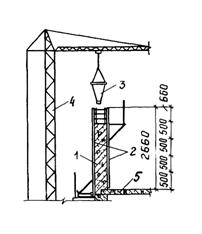 подвижность смеси должна соответствовать осадке конуса 6 - Для производства работ по бетонированию стен каждый этаж здания в плане делят на пять захваток (рис. 1). Работы ведутся по захваткам с учетом общего потока работ на типовом этаже. Непосредственно перед бетонированием и при длительных перерывах в работе необходимо с поверхности ранее уложенного бетона без ее повреждения удалить цементную пленку. Прочность бетона должна быть не менее: 30 кН/см2 - при очистке водяной или воздушной струей под напором 0,3 - 0,5 Н; 150 кН/см2 - при очистке механической металлической щеткой с последующей промывкой водой; 500 кН/см2 - при гидропескоструйной очистке. Бетонную смесь