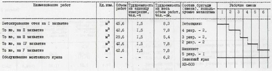 бетоном должен быть прогрет на глубину не менее Бетонирование стен выполняется звеном бетонщиков из шести человек: 4-го разр. - 2, 3-го разр. - 2, 2-го разр. - 2. Один бетонщик 2-го разр. находится внизу и принимает бетонную смесь из автобетоносмесителей в бадьи с последующей строповкой их для подачи к месту укладки. Бетонщики 4 и 3-го разр. принимают бетонную смесь, укладывают ее в опалубку и уплотняют вибраторами. Бетонщик 2-го разр. лопатой подбирает выпавший на настил бетон, в процессе бетонирования устанавливает вкладыши и каналообразователи.