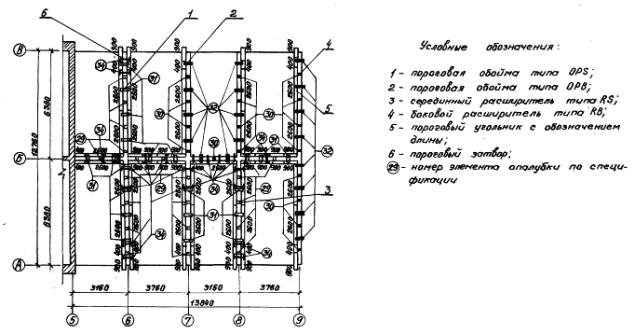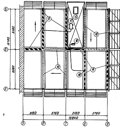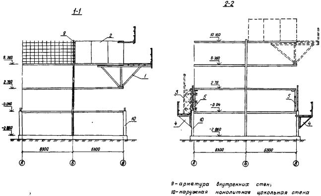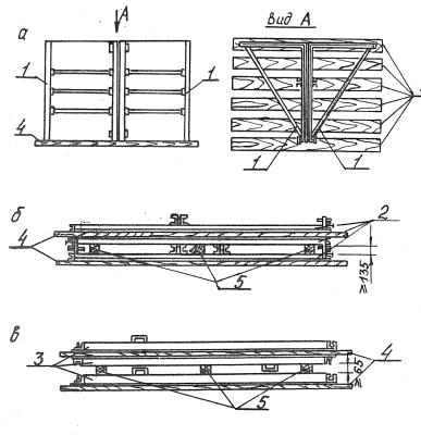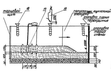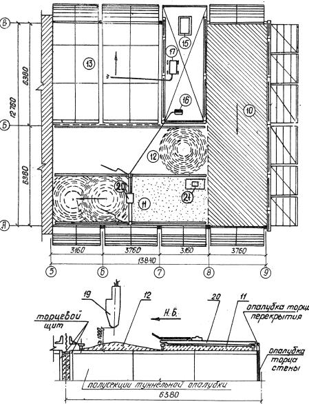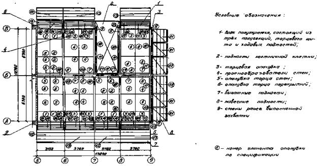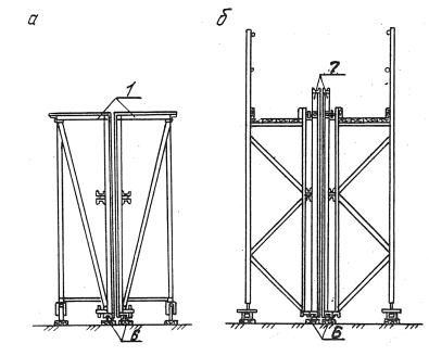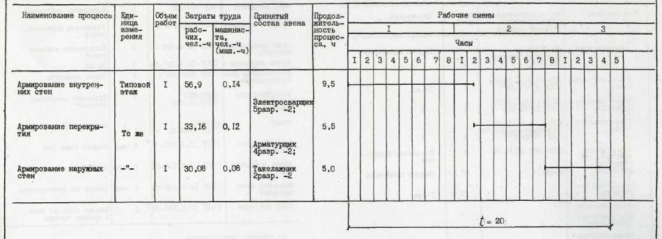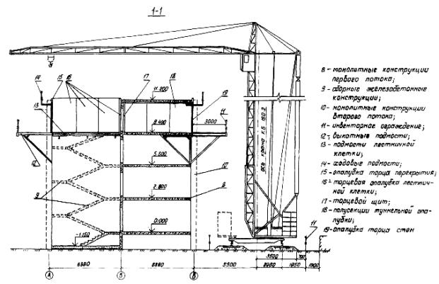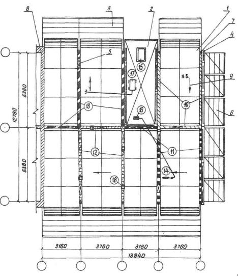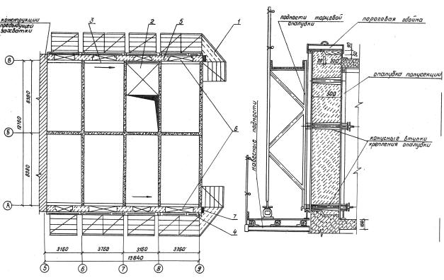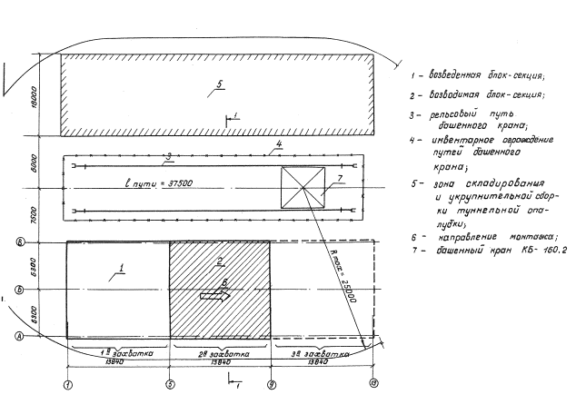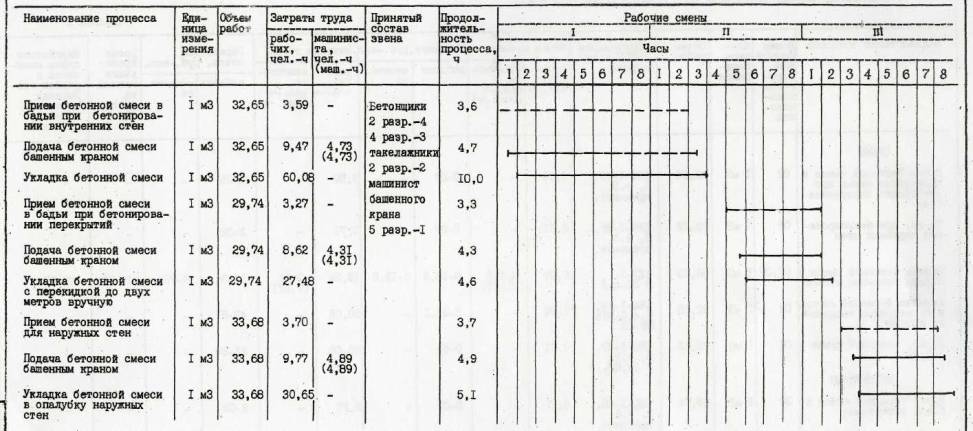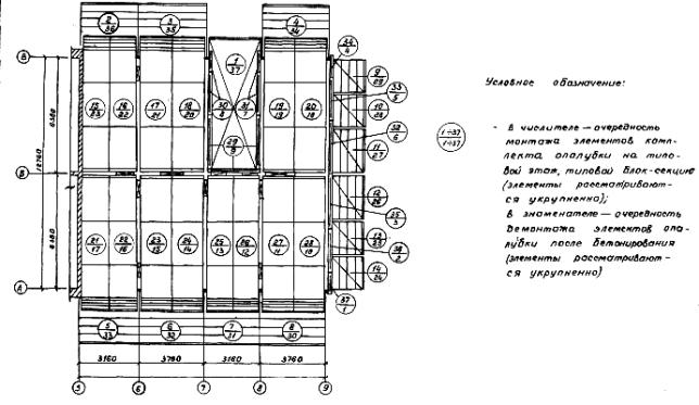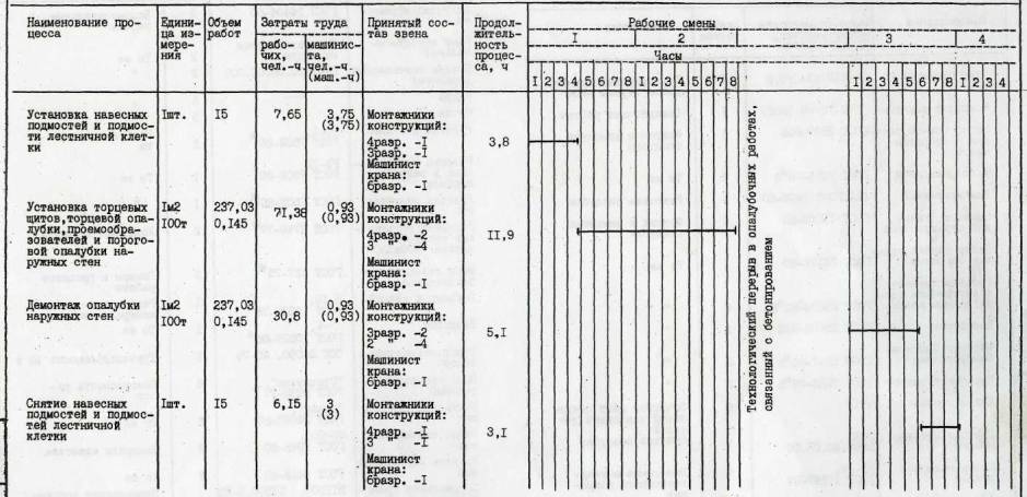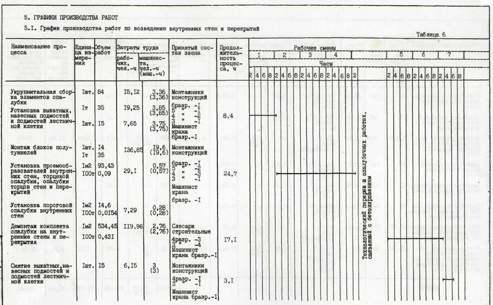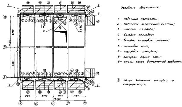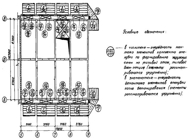 МОСКВА - 1990I. МОНТАЖ И ДЕМОНТАЖ ОБЪЕМНО-ПЕРЕСТАвНОЙ ОПАЛУБКИ СТЕН И ПЕРЕКРЫТИЙ ТИПОВОГО ЭТАЖА1. ОБЛАСТЬ ПРИМЕНЕНИЯ1.1. Типовая технологическая карта разработана на опалубочные работы с применением объемно-переставной опалубки SBM-75/м2 (ПНР) при возведении монолитного жилого дома, запроектированного для строительства в сейсмичных районах Армянской ССР. Схема производства работ представлена на рис. 1. Наружные и внутренние стены, перекрытия здания выполняются из монолитного железобетона (рис. 2-7). лестничные марши и площадки, вентблоки - сборные железобетонные. Размер здания (блок-секции) в плане 13,84 ´ 12,76 м, высота этажа - 2,8 м. Здание рассчитано на сейсмические нагрузки. 1.2. За основу разработки карты приняты чертежи индивидуального проекта АРМ 1.89-III-Ic (левая) 4-этажной, 8-квартирной, монолитной, рядовой блок-секции, разработанные проектным институтом ТашЭНИИЭП, г. Ташкент. 1.3. В технологической карте предусмотрено выполнение работ в две смены при температуре наружного воздуха выше 0°С 1.4. Суммарная масса монтируемого комплекта опалубки на типовой этаж - 82,3 т. 1.5. При привязке типовой технологической карты к конкретному объекту и условиям строительства уточняют порядок монтажа объемно-переставной опалубки в соответствии с разбивкой здания на захватки и согласно проекту производства работ, а также уточняют объемы работ, калькуляцию затрат труда, средства механизации, график производства работ. 2. ОРГАНИЗАЦИЯ И ТЕХНОЛОГИЯ ВЫПОЛНЕНИЯ РАБОТ2.1. До начала опалубочных работ должны быть выполнены следующие подготовительные работы: подготовлена площадка с твердым покрытием для чистки, смазки, сборки и разборки опалубки; доставлен в зону монтажа комплект опалубки; произведена доработка и доизготовление нестандартных полутуннелей и недостающих элементов опалубки; произведена укрупнительная сборка опалубки. Сборку опалубки должна осуществлять бригада рабочих под руководством лиц, изучивших инструкцию по применению и обслуживанию опалубки системы SВМ 75/м2. Собранные полутуннели, торцевая опалубка, подмости складируются на площадке складирования в положении, соответствующем рабочему. Шарнирные узлы и резьбовые соединения покрываются антикоррозийными смазками. 2.2. Технология возведения жилого монолитного дома посредством туннельной опалубки предусматривает ведение опалубочных работ двумя потоками. Первым потоком устанавливается опалубка, предназначенная для возведения внутренних стен и перекрытий. Вторым - опалубка, предназначенная для возведения наружных стен. 2.3. Монтаж опалубки ведется по следующей общей схеме: закрытие проемов в перекрытии инвентарными щитами (при этом щиты не должны препятствовать выкатыванию полутуннелей на выкатные подмости); установка подмостей в местах прохода, лестничной клетки; установка выкатных подмостей; установка и закрепление между собой блоков полутуннелей и проемообразователей стен; установка проемообразователей перекрытий; установка торцевой опалубки; установка опалубки торцов стен и перекрытий; установка опалубки на захватке. 2.4. С целью повышения производительности труда перед монтажом опалубки производят укрупнительную сборку полутуннелей в блоки с закреплением на них ходовых подмостей и торцевых щитов. Собранные в блоки полутуннели необходимо сразу отрегулировать. Для подачи б
