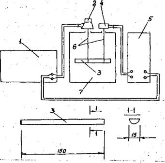 1-звуковой генератор; 2-возбудитель колебаний; 3-кювета; 4-приемник колебаний; 5-индикатор резонанса /электронный осциллограф; 6-нить стеклянная; 7-термостат