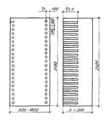 Схема расположения отверстий, на открытой поверхности стенового блока 7.4. Транспортирование сырых изделий и установку их на автоклавные вагонетки производят мостовым краном, оборудованным специальными траверсами, конструкция которых исключает деформирование продольных бортов форм. 7.5. Перемещение форм должно наполняться плавно, без толчков, поэтому рельсы следует тщательно подгонять, а рельсовые пути отрихтовывать. Перед началом производства работ необходимо проверить тормозные устройства кранов и устранить неисправности. 7.6. Ориентировочные режимы запаривания, ч : Подъем давления …………………………….2...3 (3...4) Изотермическая выдержка .…………………8...9 (6...8) Сброс давления ………………………………3…4 (3...5) Вакуумирование ……………………………….1 (1) Примечание. Режим запаривания приведен для максимального давления 8 ати (12 ати). Окончательно режим уточняется в процессе освоения производства. 7.7. После окончания процесса вакуумирования открывают крышку автоклава и охлаждают изделия до тех пор, пока разница между температурой в автоклаве и цехе составит не более 40°. 8. РАСПАЛУБКА, ХРАНЕНИЕ И ТРАНСПОРТИРОВКА ИЗДЕЛИЙ8.1. Изделия до их распалубливания рекомендуется выдерживать в цехе в течение 2 ч при температуре не ниже 15 °С. 8.2. В процессе распалубки сотрудники отдела технического контроля (ОТК) предприятия производят осмотр, приемку и маркировку готовой продукции. 8.3. Готовые изделия должны храниться в закрытых складских помещениях в рабочем положении. Перемычечные блоки укладываются на деревянные прокладки штабелями высотой до 2 и длиной до 25 м. Между штабелями предусматриваются проходы шириной не менее 0,7 м. 8.4. Изделия поднимают и перевозят в положении, предусмотренном проектом. 9. КОНТРОЛЬ ПРОИЗВОДСТВА И ПРАВИЛА ПРИЕМКИ ГОТОВЫХ ИЗДЕЛИЙ9.1. Лаборатория предприятия обязана производить контроль и анализ качества поступающих материалов, а также ведения технологического процесса. ОТК производит приемку готовой продукции, анализирует причины брака. 9.2. При поступлении на предприятие сырья контролируют: по содержанию активных CaO + MgO, температуре и скорости гашения, содержанию пережога и степени гидратации - известь; по марке, виду, началу и концу схватывания - цемент; по гранулометрическому составу, содержанию илистых, глинистых, органических примесей и гравия - песок кварцевый (не реже четырех раз в месяц); по тонкости помола - гипс полуводный; по марке - алюминиевую пудру. 9.3. Во время контроля производственного процесса проверяют: известь (известковое вяжущее) - по содержанию активных СаО + MgO (3...4 раза в смену), температуре и скорости гашения (1...2 раза в смену), содержанию пережога и степени предварительной гидратации (один раз в смену) согласно ГОСТ 22688-77; кварцевый песок - по содержанию влаги (3...4 раза в смену); песчаный шлам - по плотности и дисперсности песка (в процессе его приготовления и после заполнения шлам-бассейна); полуводный гипс - по тонкости помола (не реже одного раза в смену); суспензию алюминиевой пудры - в процессе ее приготовления; текучесть ячеистобетонной смеси (каждый 5...8-й замес); температуру ячеистобетонной смеси после выхода из газобетономешалки (каждый 5...8-й замес); длительность "созревания" бетона и температуру его разогрева (каждую 5...10-ю форму); плотность смеси (из каждой пятой формы); состояние весовых дозаторов (постоянно