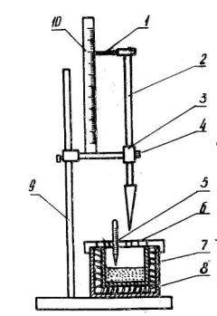 Текучесть смеси определяется специальным прибором (см. рисунок), состоящим из цилиндрического сосуда 7 объемом 3 л, снабженного теплоизоляционным кожухом 8. Сверху сосуд закрыт смотровой крышкой 6 с отверстиями для термометра 5 и подвижного стержня с наконечником 2. Стержень фиксируется зажимным винтом 4 на держателе 3 штатива 9. К стержню крепится стрелка 1,а к держателю штатива - отсчетная линейка 10.