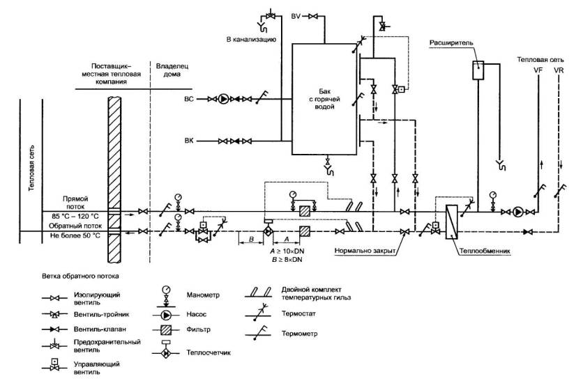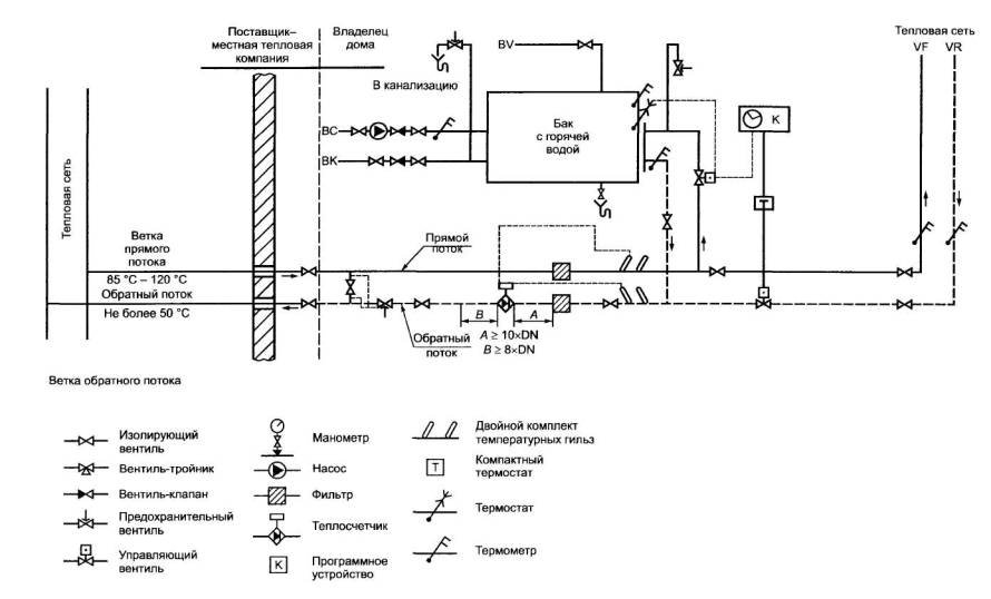 Датчики температуры прямого и обратного потоков должны быть встроены в