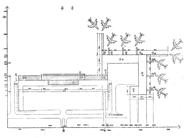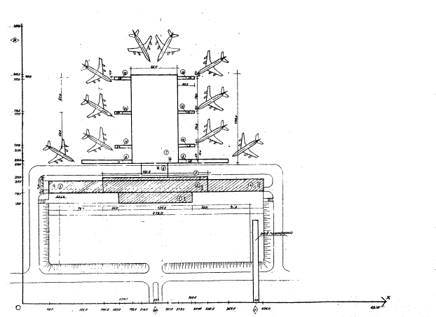 2. Пример автоматизированного проектирования.Опытная эксплуатация системы была проведена при разработке схемы генплана аэровокзального комплекса аэропорта Домодедово. В данном примере объектом формирования схемы генплана является: реконструкция существующего здания аэровокзала, строительство нового объема с размещением в нем помещений основного технологического и вспомогательного назначения, и помещений дополнительного обслуживания. На стадии «генерация вариантов» разработаны 2 варианта принципиальных компоновочных схем с учетом топологических ограничений системы В первом варианте (рис. 2) помещения основного технологического назначения (операционные помещения вылетающих и прилетевших пассажиров, помещения и зоны ожидания, зоны распределения и помещения обработки багажа) размещены во вновь возводимом двухэтажном объеме со стороны перрона. Во втором варианте вновь возводимый двухэтажный объем с теми же зонами и помещениями размещен к западу от существующего здания аэровокзала (рис. 3). В качестве исходных данных используются: 1. Экспликация зданий и технологических зон с указанием шифра (номера), используемого в программной системе; и вместимости этих зон (табл. 2.1). 2. Данные по геометрии компоновочного эскиза схемы генплана, участки застройки с различными гидрогеологическими условиями; запретные зоны; проектируемые и существующие здания и технологические зоны; вводы внешних коммуникаций. Исходные данные задаются на бланках О-ГСП, содержащих 21 таблицу. Все данные являются целыми десятичными цифрами. В качестве примера по заполнению таблиц рассмотрен вариант 1. Указания по заполнению таблиц исходных данных приведены в таблице 2.2.