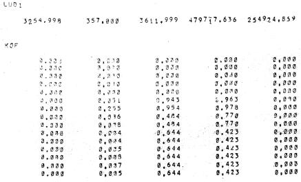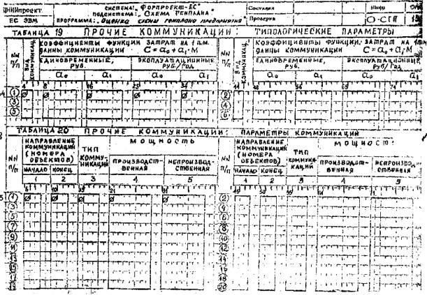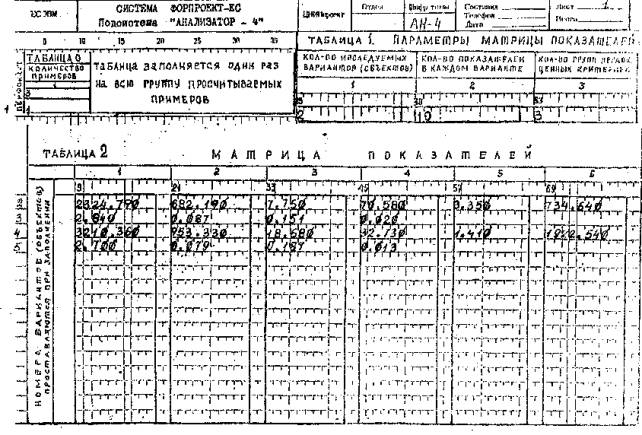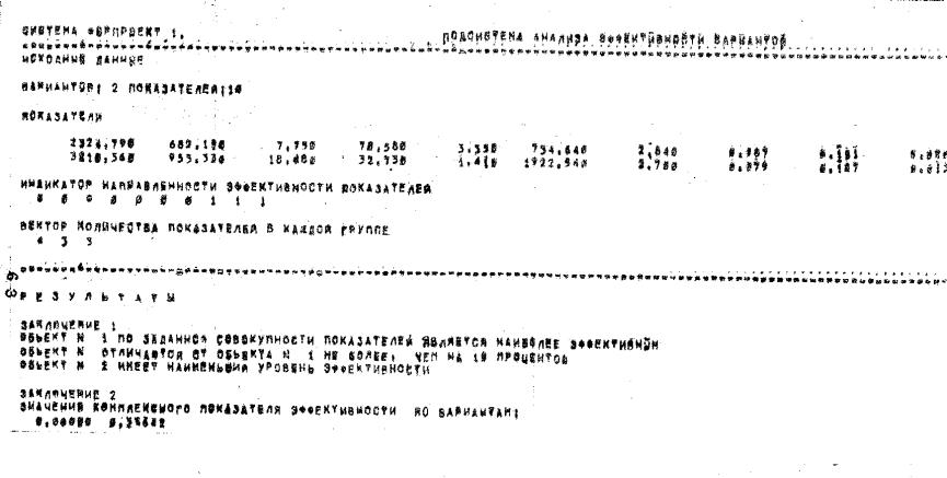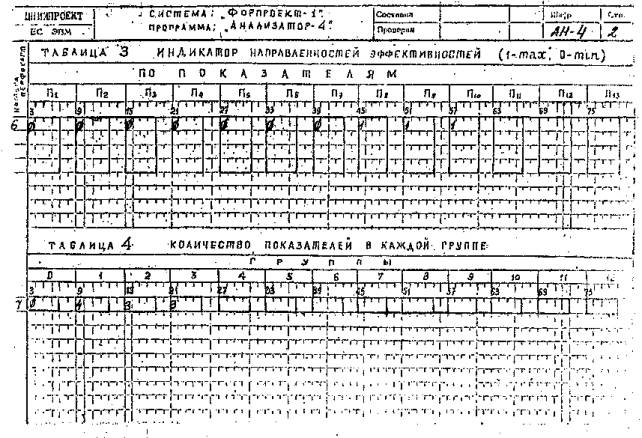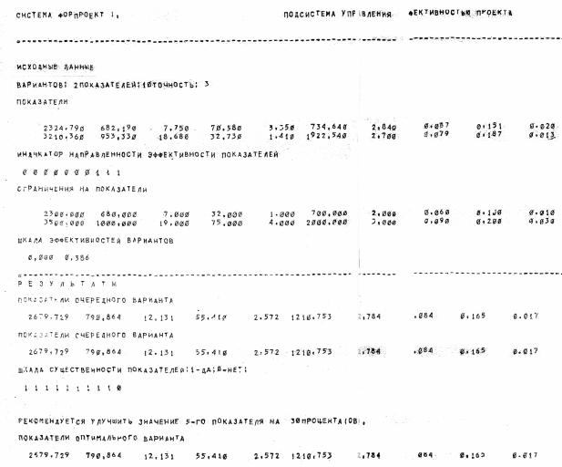 Для прогнозирования на ЭВМ значении показателей качества наиболее эффективного варианта на основе показателей двух вариантов используется подсистема «Регулятор». Исходные данные задаются в бланках РЕГ-1 в таблицах 1, 2 в виде целых десятичных чисел, в таблицах 3. 4, 5 - в виде десятичных чисел с точкой. Элементы индикатора направленностей эффективности могут принимать одно из 2-х значений: 0 или 1. "0" -: если данный показатель при повышении его эффективности стремится к min, 1 - к mах. Таблица заполняется в порядке расположения показателей в строке таблицы матрицы показателей. Таблица векторов уровней эффективности вариантов заполняется комплексными показателями эффективное - результатами счета по подсистеме «Анализатор» в порядке следования вариантов. В таблицу матрицы показателей показатели каждого последующего варианта записываются с новой строки с тем, чтобы легче было проверять правильность вносимых данных. При заполнении таблицы матрицы ограничений на показатели оптимального варианта в случае невозможности определения нижнего предела любого показателя, в соответствующей строке проставляется «0», если невозможно определить. верхний предел - ставится любое положительные число, значительно превышающее максимальное значение соответствующего показателя. Распечатки результатов отчета на ЭВМ по подсистеме «Регулятор» приведены в приложении 5 и не нуждаются в дополнительном пояснении