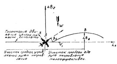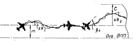 Рис. 1 Такой характер траектории обусловлен тем, что в процессе движения по ВПП на самолет действует непрерывная цепь внешних возмущений, являющихся результатом неоднородности качества поверхности ВПП, порывов ветра и т.д., на которые летчик в той или иной мере реагирует действиями на органы управления самолета и которые, в свою очередь, не являются точно рассчитанными. Такое возмущенное движение самолета можно разделить на два движения; основное, обусловленное относительно крупным возмущением, и дополнительное, обусловленное относительно мелкими возмущениями. Чтобы облегчить анализ траектории возмущенного движении самолета, целесообразно пренебречь мелкими отклонениями, и рассмотреть лишь основное движение самолета. С точки зрения определения необходимой ширины ВПП важно принять такую расчетную схему, которая обеспечивала бы наибольшее реально возможное отклонение самолета от оси ВПП. При заходе на посадку при наличии бокового ветра летчик вынужден для парирования сноса самолета лететь со скольжением и креном. Непосредственно перед приземлением скольжение и крен должны быть ликвидированы. Однако, здесь возможны случайные ошибки, в результате которых приземление самолета происходит .под некоторым углом к оси ВПП. Причиной возникновения этого угла в момент приземления могут быть также случайный порыв ветра или удар одним колесом о поверхность ВПП. В результате приземления под некоторым углом к оси ВПП возникают внешние возмущающие силы, и самолет дополнительно отклоняется от оси ВПП на некоторую величину ΔВ1, а затем благодаря своей путевой устойчивости движется по некоторой кривой, ассимптотически приближающейся к направлению, параллельному оси ВПП. Если скорость бокового ветра не превышает определенной для каждого типа самолета величины, то летчик, действуя на первом этапе пробега рулем направления, может вести самолет по намеченному направлению движения. На этом этапе пробега, когда носовое колесо еще остается приподнятым, летчик не может пользоваться раздельным торможением колес, а эффективность руля направления постепенно падает с уменьшением скорости движения самолета. Начиная с некоторого значения скорости движения эффективность руля направления падает настолько, что у летчика становится уже недостаточно средств для выдерживания направления движения и начинается разворот самолета против ветра. Если в этот момент продольная ось самолета в силу каких-то случайных причин внезапно отклонилась от направления движения на некоторый угол βo в сторону ветра, то это вызовет более интенсивное движение самолета по некоторой кривой в этом же направлении от оси ВПП (рис. 2). Нарастание отклонения будет происходить до тех пор, пока не опустится носовое колесо, т.е. пока летчик не получит в свои распоряжение новое средство для выдерживания направления движения - раздельное торможение колес. Указанные отклонения ΔВ1 и ΔВ2 равновозможны в обе стороны от оси ВПП.