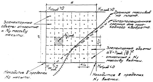 где Vв/н - объем выемки или насыпи, заключенный в пределах полного квадрата; а - размер стороны квадрата; n - количество шагов разбиения стороны квадрата; hijраб - рабочая отметка в центре элементарного квадрата ij (рис. 2).