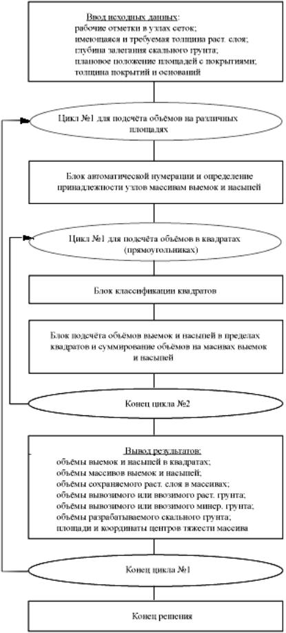 Рис. 4. Блок-схема программы подсчета объемов земляных работ на летном поле Литература 2. Полосин Ю.К., Методы оптимального проектирования железных дорог. ВАТТ, Л., 1963. 3. Дранишников Ю.А. Проектирование рельефа ВПП, РД, грунтовых МС и перронов аэропортов с применением ЭВМ. Труды ГПИ и НИИ Аэропроект , вып. 8, М.,1970. Канд. техн. наук Л.С. Райз,