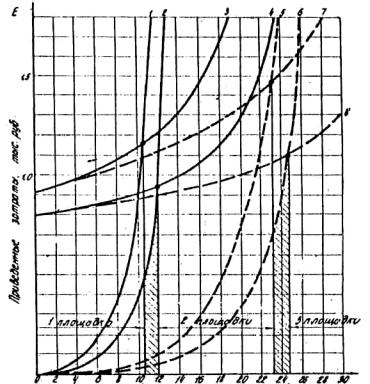 Xк,ук - координаты центров тяжести к-го массива; хi ,уi - координаты элементарного объема i; Vк - объем массива к. Подсчет объемов работ с различными видами грунтов. В обычном проектировании подсчет объемов работ с различными видами грунтов минеральным, скальным, растительным и т.д., производится раздельно, то есть сначала определяется общий объем массива, затем объем имеющегося и требуемого растительного грунта и т.д. При подсчете объемов на ЭВМ удобнее определять все интересующие объемы одновременно. Возможность одновременного вычисления объемов для всех видов земляных работ появляется не только как результат огромных вычислительных возможностей ЭВМ, но исходит и из существа самой задачи. Действительно, если выделить в какой-либо точке летного поля элементарную грунтовую призму, то по отношению к данной призме могут быть решены почти все вопросы, касающиеся объемов земляных работ, независимо от того, какие работы требуется проводить на других участках, а именно, могут быть определены следующие объемы: - объем растительного слоя, сохраняемого на месте; - объем растительного слоя, который нужно подвезти со стороны, если имеющейся толщины растительного слоя недостаточно; - объем растительного слоя, который требуется обязательно удалить (например, с площади покрытий); - объем растительного слоя, который может быть вывезен и использован на других участках; - объем минерального грунта, который нужно привезти или вывезти, с учетом работ с растительным слоем, работ по замене грунтов или их обжатию; - общий объем выемки или насыпи, содержащийся в данной призме. С точки зрения уменьшения объема программы и потребного машинного времени вычисление объемов всех видов грунта удобно производить сначала для каждой элементарной призмы, относящейся к соответствующему элементарному квадрату разбиения. Затем вычисленные объемы сразу же суммируются с объемами в квадратах, массивах и по всему летному полю. Вычисление глубин залегания различных слоев производится с помощью тех же интерполяционных процедур, что и для поверхности участка, но данным цифровой модели участка для узлов сетки исходных квадратов. Для некоторых видов работ, например, работ подготовительного никла, работ по выторфовыванию, снятию слоя мха и т.д. может оказаться целесообразным произвести определение работ отдельно. В этом случае в исходящую информацию для подсчета объемов должны быть внесены изменения, учитывающие проведенные работы на подготовительном этапе. Аналогичным образом следует поступать и при подсчете объемов на площадях с аэродромными покрытиями, где удобнее предварительно внести поправки в положение черной поверхности, учитывающие необходимость снятия растительного слоя, в положение проектной поверхности с учетом толщины покрытия в основании, а затем полученные рабочие отметки использовать для подсчета объемов земляных работ на ЭВМ. 2. Автоматическое исключение из подсчета объемов, расположенных на площадях с покрытиями, при подсчете объемов для грунтовой части летного поляПодсчет объемов земляных работ на летном поле производится раздельно для грунтовой части и для площадей с аэродромными покрытиями, В соответствии с построением ЦМУ на сетку квадратов грунтовой части могут произвольным образом накладываться собственные сетки квадратов и