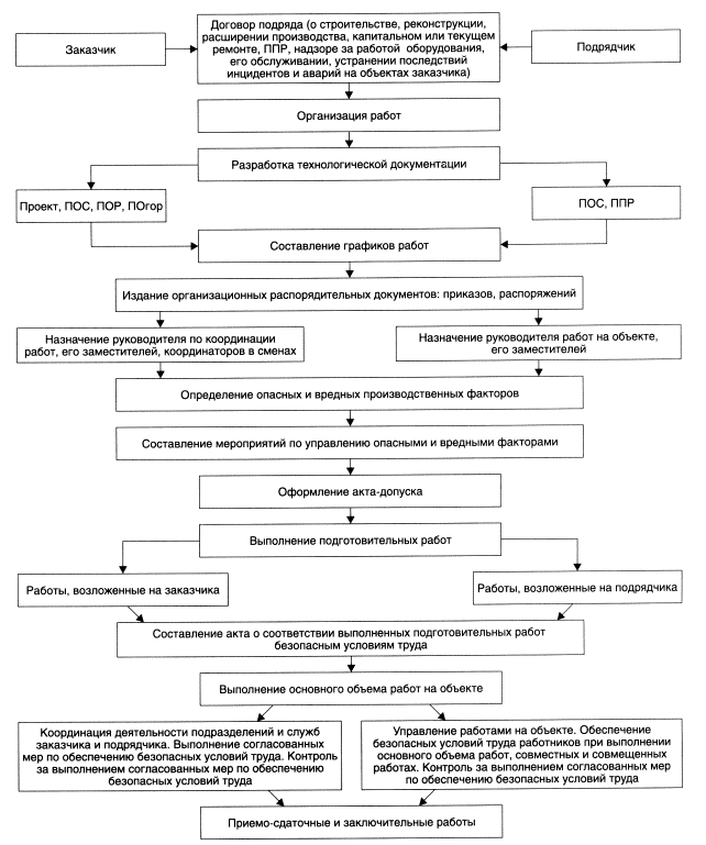 Рис. 1. Схема организации работ повышенной опасности требованиям безопасности труда и готовности объекта к началу работ (приложение В); - осуществляет контроль за организацией генеральным подрядчиком (подрядчиками) совместных и совмещенных работ, исполнением генеральным подрядчиком (подрядчиками) согласованных условий производства работ и соблюдением графика работ. 5.1.3. Координаторы работ в сменах: - согласовывают в нарядах-допусках подрядчика (подрядчиков) мероприятия, обеспечивающие безопасные условия труда и подлежащие выполнению работниками производственного структурного подразделения; - осуществляют выполнение мероприятий, обеспечивающих безопасные условия труда и подлежащих выполнению работниками производственного структурного подразделения; - оказывают содействие руководителям работ подрядчика (подрядчиков) в осуществлении мероприятий, обеспечивающих безопасные условия труда; - осуществляют контроль за исполнением согласованных ими мероприятий, обеспечивающих безопасные условия труда. 5.2. Требования к подрядной организации (по согласованию)5.2.1. До начала производства работ по реконструкции, расширению действующих производств, капитальному и текущему ремонту объектов Общества в производственном структурном подразделении работниками подрядной организации руководитель этой подрядной организации издает приказ (распоряжение), которым определяет: - руководителя работ на объекте и его заместителей в сменах (при многосменном выполнении работ); - руководителей и специалистов, на которых возлагается обязанность выдачи нарядов-допусков; - работников, имеющих право производства грузоподъемных операций (работников, ответственных за безопасное производство работ кранами, машинистов грузоподъемных кранов, операторов кранов, управляемых с пола, стропальщиков). 5.2.2. Руководитель работ на объекте: - обеспечивает составление ППР и согласование его с руководителем структурного производственного подразделения либо специалистом, им уполномоченным; - составляет чертеж (схему) с обозначением границ и отметок по высоте для включения их в акт-допуск, согласовывает его (ее) с руководителем производственного структурного подразделения либо специалистом, им уполномоченным; - составляет совместно с руководителем по координации работ от производственного структурного подразделения перечень опасных и вредных производственных факторов (приложение А), не связанных с характером работ, выполняемых подрядчиком (предопределенных условиями действующего производства), а также опасных и вредных производственных факторов, возникающих в результате деятельности подрядчика, согласовывает его с руководителем производственного структурного подразделения либо специалистом, им уполномоченным, и утверждает своим руководителем либо сам по его поручению; - разрабатывает и согласовывает с руководителем производственного структурного подразделения либо специалистом, им уполномоченным, мероприятия по обеспечению безопасных условий труда при производстве работ для включения их в акт-допуск; - оформляет совместно с руководителем производственного структурного подразделения либо специалистом, им уполномоченным, акт-допуск в двух экземплярах, по одному для каждой из сторон; - составляет и согласовывает со специалистами про