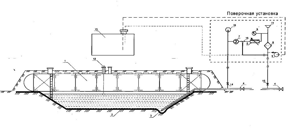 4.1.2. При соблюдении указанных в таблице 1 пределов допускаемой погрешности измерений допускаемая относительная погрешность определения вместимости (градуировочной таблицы) резервуара должна находиться в пределах ±0,25 %. 4.2. Требования по применению основных и вспомогательных средств поверки. 4.2.1. Эталонный счетчик жидкости (далее - счетчик жидкости) с пределами допускаемой погрешности ± 0,15 % по [1] и МИ 583-84; 4.2.2. Эталонный уровнемер (далее - уровнемер) с диапазоном измерений 0-9мис пределами допускаемой абсолютной погрешности ±1 мм по [2] и РД 50-388-83; 4.2.3. Термометр с ценой деления ОД °С по ГОСТ 28498-90. 4.2.4. Манометр класса точности 0,4 по ГОСТ 2405-88 4.2.5. Рулетка измерительная с грузом 2-го класса точности с верхним пределом измерений 10 м или 20 м по ГОСТ 7502-98. 4.2.6. Ареометр с ценой деления 0,5 кг/м3 по ГОСТ 18481-81. 4.2.7. Секундомер с пределами допускаемой абсолютной погрешности ± 0,001 с по [3]. 4.2.8. Линейка измерительная металлическая с диапазоном измерений от 0 до 500 мм по ГОСТ 427-75 или штангенциркуль с диапазоном от 0 до 250 мм по ГОСТ 166-89. 4.2.9. Газоанализатор АНТ-2М по [4]. 4.2.10. Вспомогательные средства поверки: - насос для подачи жидкости, снабженный линиями приема и подачи с задвижками; - фильтр-газоотделитель; - трехходовой кран. 4.2.11. Средства измерений должны быть включены в Госреестр СИ и поверены в установленном порядке. 4.2.12. Допускается применение средств измерений и вспомогательного оборудования других типов и марок по метрологическим и техническим характеристикам удовлетворяющих требованиям настоящей рекомендации. 4.3. Требования к условиям поверки 4.3.1. При проведении поверки резервуара должны быть соблюдены следующие условия: - температура окружающего воздуха (20±20) °С; - температура жидкости для измерения вместимости (20±15) °С; Примечание: При применении в качестве поверочной жидкости нефтепродуктов допускается температура окружающего воздуха от минус 15 до плюс 35 °С ,нижний предел температуры жидкости для измерения вместимости допускается до минус 15 °С - при применении бензина, до плюс 2 °С - при применении дизельного топлива, верхний предел температуры бензина не должен превышать плюс 25 °С. 4.3.2. Изменение температуры поверочной жидкости в резервуаре и счетчике жидкости за время поверки не должно превышать: 2 °С - при применении воды, 0,5 °С - при применении нефти или нефтепродуктов. 4.3.3. При невыполнении 4.3.2 вводят температурные поправки на объем, измеренный через каждое изменение температуры поверочной жидкости на 2 °С или 0,5 °С соответственно. 4.3.4. Расход жидкости должен находиться в нормированных пределах диапазона изменений счетчика жидкости. При этом относительное изменение расхода жидкости в процессе поверки резервуара не более 2 %. 4.3.5. Характеристики счетчика жидкости должны быть определены для применяемой поверочной жидкости. 4.3.6. Процесс определения вместимости резервуара должен идти без перерывов, приводящих к изменению объема и уровня жидкости в резервуаре, начиная с уровня, равного нулю, до максимального уровня или уровня определенной дозы. 4.3.7. Скорость наполнения резервуара в процессе поверки не должна превышать 0,3 мм/с. 5. Требования к порядку проведения поверки5.1. Резервуары подлежат поверке организациями государственной метрологической службы или аккредитованными на право поверки метрологическими службами юридических лиц. 5.2. Устан
