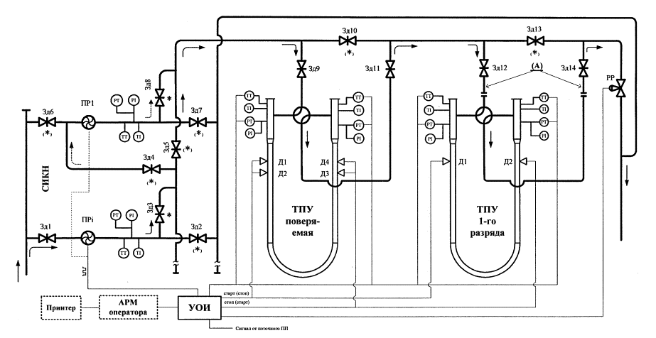 Рисунок 1 - Принципиальная схема соединений поверяемой ТПУ и средств поверки при использовании ПР, установленного на СИКН или СИКНП, в качестве компаратора ПР1 -контрольно-резервный ПР; ПРi - рабочий ПР, установленный на i-ой ИЛ; РТ - измерительный преобразователь избыточного давления; PI - манометр; ТТ -датчик температуры; Д1...Д4-детекторы ТПУ; УОИ - устройство обработки информации; Зд1...Зд14 - задвижки (шаровые краны); РР - регулятор расхода. Примечания 1 На рисунке приведена технологическая схема СИКН, оснащенная ТПР (условно). Остальные ИЛ, фильтры-грязеуловители, струевыпрямители, установленные на ИЛ, дренажные и воздушные вентили, установленные на СИКН и ТПУ, поточный измерительный преобразователь плотности условно не показаны. 2 (*) - задвижки (шаровые краны) с гарантированным перекрытием потока и устройствами контроля отсутствия протечек, могут быть применены электроприводные. 3 (А) - место для установки измерительных преобразователей избыточного давления и датчиков температуры при их отсутствии на ТПУ 1-го разряда