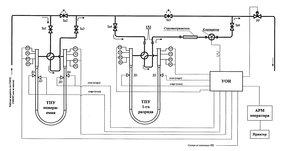 Рисунок 2 - Принципиальная схема соединений поверяемой ТПУ и средств поверки при применении отдельно монтируемого компаратора РТ - измерительный преобразователь избыточного давления; PI - манометр; ТТ - датчик температуры; Д1...Д4 - детекторы ТПУ; УОИ - устройство обработки информации; Зд1...Зд6 - задвижки (шаровые краны); РР - регулятор расхода. Примечания 1. Дренажные в воздушные вентили, установленные на ТПУ и технологических трубопроводах, условно не показаны. 2. (*) - задвижки (шаровые краны) с гарантированным перекрытием потока и устройствами контроля отсутствия протечек, могут быть применены электроприводные. 3. (А) - место для установки измерительных преобразователей избыточного давления и датчиков температуры при их отсутствии на ТПУ 1-го разряда.
