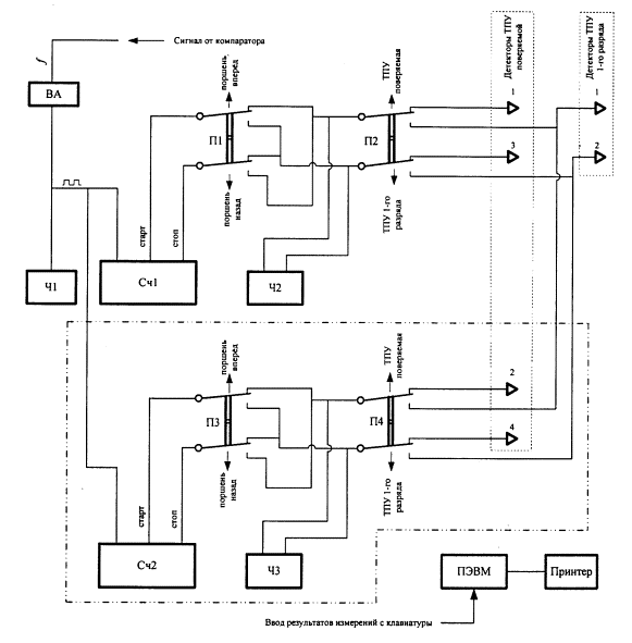 Рисунок 3 - Принципиальная схема соединений средств поверки ТПУ при замене УОИ другими средствами поверки ВА - вторичная аппаратура компаратора; Ч1 - частотомер, применяемый в режиме измерений частоты; Ч2, Ч3 - частотомеры, применяемые в режиме измерений интервала времени; Сч1, Сч2 -счетчики импульсов; П1...П4 - переключатели электрические; ПЭВМ - персональный компьютер (офисный) в комплекте с принтером. Примечания 1 При поверке ТПУ с одной парой детекторов (1-3) счетчик импульсов Сч 2 и частотомер Ч3 не используют (вторую половину схемы, выделенную штрихпунктирной линией, не собирают). 2 Подключение измерительных преобразователей избыточного давления, датчиков температуры, поточного измерительного преобразователя плотности условно не показаны. 3 Для вычислений, оформления и печати протокола поверки рекомендуется использовать ПЭВМ с принтером при наличии в ПЭВМ соответствующей программы. Результаты измерений, полученные при поверке, вводят в ПЭВМ с клавиатуры. 4 «старт», «стоп» - начало и конец отсчета количества импульсов компаратора соответственно. 7.7 Проверяют отсутствие протечек рабочей жидкости через запорные органы задвижек (шаровых кранов), на рисунках 1 и 2 обозначенных (*), дренажных и воздушных вентилей при их закрытом положении. В случае отсутствия возможности визуальной проверки герметичности запорных органов задвижек и вентилей или при установлении их негерметичности, во фланцевые соединения устанавливают соответствующие заглушки. Примечание - Операции по 7.6 и 7.7 выполняют с соблюдением правил промышленной безопасности, действующих на объекте, где эксплуатируют ТПУ (СИКН или СИКНП). 7.8 Проводят проверку герметичности (отсутствия протечек) узла переключения направления движения рабочей жидкости (четырехходового крана) ТПУ согласно эксплуатационной документации. Для двунаправленных ТПУ проверку герметичности проводят в обоих направлениях движения шарового поршня. 7.9 Проводят монтаж (установку) остальных средств поверки и необходимые электрические соединения согласно рисункам 1, 2 или 3 в зависимости от применяемых средств поверки, проверяют правильность соединений. Примечание - При реализации технологической схемы по 7.3.1.3 кабель контрольно-резервного ПР отключают от СОИ СИКН (СИКНП) и подключают к УОИ. 7.10 Проверяют отсутствие воздуха (газа) в технологической схеме. При любом значении расхода (от Qпрom до Qмх) проводят несколько пусков шаровых поршней обеих ТПУ. При этом открывают воздушные вентили, установленные на обеих ТПУ, на верхних точках технологических трубопроводов, на ИЛ с компаратором и т.д. и проверяют наличие воздуха (газа), при необходимости воздух (газ) выпускают. Считают, что воздух (газ) в технологической системе отсутствует, если из воздушных вентилей вытекает струя рабочей жидкости без пузырьков воздуха (газа). 7.11 Контролируют стабилизацию температуры рабочей жидкости, для чего через технологическую схему устанавливают расход QМХ (м3/ч) согласно 5.13 и проводят последовательные пуски шаровых поршней обеих ТПУ. Температуру считают стабильной, если за один проход поршня каждой ТПУ изменение температуры не превышает 0,2°С. 7.12 Подготавливают средства поверки к ведению поверочных работ согласно инструкциям по их эксплуатации. 7.13 При использовании массомера в качестве компаратора включают в работу пот