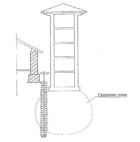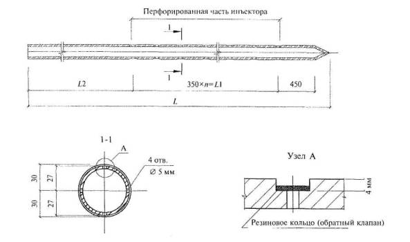 Рисунок 4,2 - Конструкция инъектора 4.16 Инъектор представляет собой трубу с отверстиями (рис. 4.2), расположенными с шагом по высоте 0,3 м (перфорированная часть). На боковой поверхности трубы проточены круговые канавки, в каждой из которых просверлено по четыре отверстия диаметром 5-7 мм. Отверстия закрыты резиновыми кольцами, выполняющими роль обратного клапана. 4.17 Пакер представляет собой трубу с отверстиями, просверленными с тем же шагом, что и в инъекторе, и двумя манжетами, препятствующими прохождению инъекционного раствора. При длине пакера 0,5 м единовременно инъектируется зона 0,3 м, далее пакер передвигается вниз на 0,3 м и инъектируется следующая зона. 4.18 В качестве инъекционного раствора может использоваться цементный раствор с добавками и заполнителями. Водоцементное отношение (В/Ц) рекомендуется применять в пределах 0,81-2. Состав раствора уточняется по результатам работ на опытном участке. 4.19 В качестве добавки может применяться бентонит (до 10 % массы цемента) для получения минимального водоотделения и жидкое стекло (3 % массы цемента) для повышения пластичности раствора и сокращения сроков схватывания. Возможно также применение суперпластификатора С-3 в количестве 1 % массы цемента. 4.20 В качестве заполнителя, сокращающего количество применяемого цемента, в инъекционном растворе может быть использована зола-уноса, являющаяся отходом производства тепловых электростанций при сухом золоудалении. Размер добавки золы-уноса в растворе определяется на основе лабораторных исследований. 4.21 Для приготовления инъекционного раствора следует применять портландцемент по ГОСТ 10178. 4.22 Нагнетание инъекционного раствора в инъектор производится порциями (обычно по 30-50 л) при каждом положении пакера (сверху вниз). 4.23 Давление нагнетания на первом этапе (заполнительная цементация) составляет 0,3 - 0,5 МПа, на втором и последующих этапах (стадия компенсационного нагнетания) оно может достигать 4-5 МПа. Сразу после инъекции раствора скважина промывается, пакер передвигается в обратном направлении (снизу вверх) с интервалом, кратным расстоянию по высоте между отверстиями инъектора. При каждом положении пакера в скважину закачивается 5 л воды. 4.24 В процессе строительства при изменении НДС грунта должна производиться дополнительная закачка цементного раствора до его восстановления (компенсационное нагнетание). 4.25 При устройстве геотехнического барьера для защиты существующих зданий от влияния котлованов первоначально выполняется заполнительная цементация. В случае поэтапной откопки котлована (для выполнения крепления ограждающей конструкции распорками, подкосами, анкерами) компенсационное нагнетание следует выполнять на каждом этапе. 4.26 При устройстве геотехнического барьера при проходке тоннелей до начала работ следует выполнить заполнительную цементацию. После устройства выработки (продавливания трубы, проходки микротоннеля и т.п.) выполняется первый цикл компенсационного нагнетания. Второй цикл компенсационного нагнетания выполняется не ранее 7-10 дней после выполнения первого цикла. 4.27 При устройстве геотехнического барьера для уменьшения влияния строящегося здания на существующее здание до начала строительства выполняется заполнительная цементация. Первый цикл компенсационного нагнетания выполняется после приложен