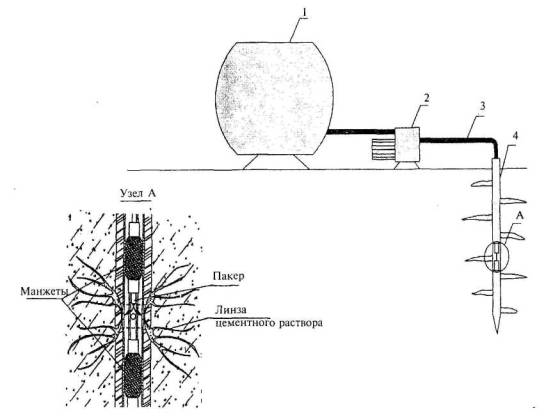 1 - емкость с раствором; 2 - насос; 3 - шланг высокого давления; 4 - инъектор Рисунок 4.1 - Технологическая схема выполнения работ по устройству геотехнического барьера 4.11 Погружение инъекторов следует производить путем задавливания статической нагрузкой или забивкой. При необходимости допускается погружение инъекторов в ранее пробуренные скважины, предварительно заполненные тампонажным глинисто-цементным раствором. Диаметр скважины не должен превышать диаметр инъектора более чем на 15 мм. 4.12 Способ погружения инъекторов зависит от фунтовых условий, глубины и наклона скважин, категории состояния защищаемого здания и т.д., но не должен влиять на техническое состояние существующих зданий. Способ погружения должен быть согласован с проектной организацией, разработавшей проект геотехнического барьера. 4.13 В том случае, если погружение инъекторов производится в пробуренную скважину, их бурение следует производить с обсадкой скважины трубами или под бентонитовым раствором. 4.14 Инъекцию цементного раствора следует проводить в порядке, оговоренном проектом. Цементацию рекомендуется производить в две очереди, первоначально обрабатывая все инъекторы нечетного, затем четного рядов. 4.15 Нагнетание инъекционного раствора производят через тампон (пакер), который передвигается внутри инъектора (рис. 4.2).