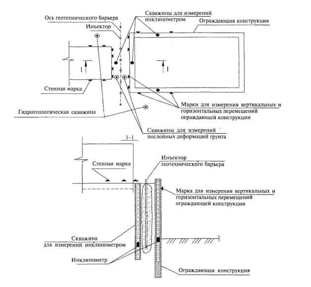 Рисунок 6.1- Примерная схема расположения марок и скважин при проведении мониторинга (в случае устройства котлована) 6.6 Мониторинг состояния основных несущих конструкций существующих зданий заключается в периодическом визуальном обследовании конструкций и в определении осадок фундаментов (нивелирование) с помощью стенных марок. Класс нивелирования назначается в зависимости от категории состояния существующих зданий, но не ниже второго. Для геодезических наблюдений за перемещениями несущих конструкций существующего здания или сооружения при устройстве геотехнического барьера рекомендуется применять автоматическую оптическую систему «Циклоп» или другую аналогичную систему. 6.7 При устройстве котлованов мониторинг перемещений ограждающей конструкции заключается в определении с помощью тахеометра плановых перемещений ограждающей конструкции по маркам, установленным на разной высоте, или с помощью инклинометров. Инженерно- геодезические измерения проводятся вторым классом. 6.8 Мониторинг подземных коммуникаций заключается в визуальном обследовании состояния колодцев и поверхности грунта вдоль трасс водонесущих коммуникаций, а также в определении осадок и плановых перемещений обечаек колодцев водонесущих коммуникаций. 6.9 Мониторинг гидрогеологических условий площадки заключается в периодическом измерении уровня подземных вод и сопоставлении его с прогнозными значениями. 7 Техника безопасности при производстве работ по устройству геотехнического барьера7.1 При производстве работ по устройству геотехнического барьера должны строго соблюдаться правила техники безопасности при строительных и горных работах, а также при работах на паровых, компрессорных, гидравлических и электрических установках согласно СНиП 12-03 и СНиП 12-04. 7.2 К техническому руководству инъекционными работами допускаются лица с дипломами специальных учебных заведений, дающими право технического руководства. 7.3 Все рабочие и служащие, занятые на инъекционных и ремонтных работах, в обязательном порядке проходят предварительное обучение технике безопасности. Перед началом работ все рабочие должны получить вводный инструктаж по технике безопасности от инженера, а на рабочем месте - от мастера или производителя работ. Повторный инструктаж по технике безопасности проводится не реже одного раза в три месяца. 7.4 Все лица, прошедшие предварительное обучение по технике безопасности и получившие вводный инструктаж от инженера, мастера или производителя работ, обязаны уметь пользоваться первичными средствами пожаротушения (огнетушители, песок, вода и т.п.). 7.5 Все рабочие и служащие, а также лица технического надзора в зависимости от характера выполняемой работы должны быть снабжены индивидуальными средствами защиты: непромокаемой одеждой и обувью, предохранительными поясами и касками, рукавицами, респираторами, перчатками. Лица, не умеющие пользоваться индивидуальными средствами защиты, а также не имеющие последних, к работе не допускаются. 7.6 Место производства работ (буровая площадка, растворный узел, леса, подмости и т.п.) должно быть очищено от мусора, освобождено от посторонних предметов, достаточно освещено как днем, так и в темное время суток, иметь удобные подъездные или пешие подходы. Растворный узел должен иметь надежную визуа