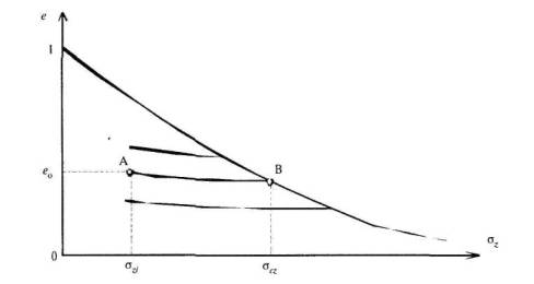 Рисунок 1 - Результаты компрессионных испытаний пасты грунта и определение по ним ранее действующего давления на образец грунта σcz 1 Первоначально определяются начальный коэффициент пористости естественного грунта ео и эффективное напряжение на глубине zi (в месте отбора образца грунта) σzi=γi*zi, где γi - удельный вес вышерасположенного грунта, в том числе с учетом взвешивающего действия воды, если место отбора образца находится ниже уровня подземных вод. 2 Из грунта нарушенной структуры, отобранного с глубины zi, приготавливается паста мягкопластичной консистенции. 3 Паста грунта уплотняется как в процессе стандартных компрессионных испытаний. 4 После того, как грунт уплотнится до коэффициента пористости больше коэффициента пористости естественного грунта еo, производится разгрузка на каждой ступени нагружения (декомпрессия). Разгрузка во всех случаях производится до σzi. 5 Определяется положение точки А на рис. 1 с координатами eo, σzi, соответствующими естественному состоянию грунта. 6 От точки А проводится линия декомпрессии параллельно линиям декомпрессии грунта до пересечения с компрессионной кривой (точка В). Координата точки В по оси σz соответствует максимальному давлению σсz, которым грунт был когда-то уплотнен. Кривая нагрузки - разгрузки образца 1-В-А повторяет историю уплотнения (образования) грунта. 7 По полученным значениям определяется коэффициент OCR по следующей формуле:
