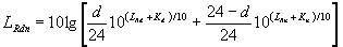 где d - продолжительность дня, ч; LRd - дневной оценочный уровень с учетом коррекций на источник и характер шума, дБ; LRn - ночной оценочный уровень с учетом коррекций на источник и характер шума, дБ; Kd - коррекция на выходные дни, если применяется, дБ; Кп - коррекция на ночь, дБ. Для определения оценочного уровня в периоде «день-вечер-ночь» LRden, дБ, может быть использована аналогичная формула