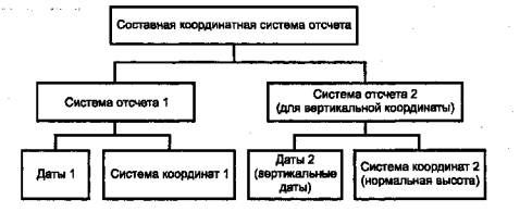 Рисунок 1 - Координатная система отсчета 5.2.3 Составная координатная система отсчета Горизонтальные и вертикальные компоненты положения объекта в трехмерном физическом пространстве, как правило, могут быть выбраны из разных координатных систем отсчета. Таким является описание положений объектов с использованием высот, отнесенных к уровню моря, и горизонтальных координат, отнесенных к другой системе. При этом применяют составную координатную систему отсчета, которая объединяет две используемые координатные системы отсчета в соответствии с рисунком 2.