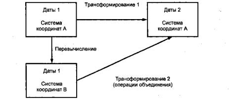 Рисунок 2 - Составная координатная система отсчета 5.3 Исходные даты 5.3.1 Типы исходных дат Даты могут быть геодезическими, высотными и местными. Геодезические даты обеспечивают связь координатной системы с Землей и используются для двух- или трехмерных систем отсчета. Они должны включать определение эллипсоида. Высотные даты обеспечивают связь нормальных высот с поверхностью квазигеоида. Местные даты применяют для локальных геодезических задач. Связь местных дат с Землей может быть неопределенной. Местные даты применимы к местным геодезическим отсчетным основам. Для геоинформационных задач необходимо идентифицировать даты, но определение дат является необязательным. 5.3.2 Описание исходных дат Описание исходных дат является обязательным, если не приведена ссылка на документы по применяемой координатной системе отсчета. 5.3.3 Начальный меридиан Начальный меридиан определяет начало отсчета долгот. Описание начального меридиана необязательно при использовании вертикальных и местных дат и когда начальный меридиан является Гринвичским. Для геодезических дат и при использовании в качестве начального иного меридиана описание начального меридиана обязательно. 5.4 Система координат Для системы координат набор данных должен включать: название, единицы измерения, направление и взаимное чередование осей. Координаты в соответствующих наборах данных представляют в соответствии с этим чередованием. Координаты, основанные на координатных системах отсчета картографических проекций, являются результатом перевычисления. Операция перевычисления - в 5.5. Описание системы координат в ГИС должно быть обязательным, если не даны ссылки на соответствующий документ, содержащий ее описание. Каждая ось системы координат должна быть описана, последовательность описания осей соответствует порядку расположения координат в наборе данных. 5.5 Операции - перевычисление и трансформирование 5.5.1 Общие положения Информация об операциях должна быть представлена, если наборы данных, содержащие координаты, использующие разные координатные системы отсчета, должны быть объединены. Различаются два типа операций: - перевычисление координат из одной координатной системы в другую при неизменных датах; в этой операции значения параметров являются точными; - трансформирование координат из одной системы в другую при их различных геодезических датах. При этом трансформирование отличается от перевычисления тем, что значения параметров трансформирования определяются опытным путем, поэтому они могут иметь несколько различных оценок или реализаций. Изменения координат одной координатной системы отсчета при переходе к другой происходят в результате операций, состоящих из одного или более трансформирования и одного или более пересчета. Описание операций является обязательным, если координатные системы являются проекционными и не приведены ссылки на описание координатной системы отсчета и системы координат. Операции должны быть описаны в наборе данных в порядке их следования. 5.5.2 Перевычисление координат Перевычисление геодезических координат в плоские прямоугольные координаты широко используют при картографическом проектировании. Перевычисление также используют для изменения единиц измерения или сдвига начала отсчета плановых координат 