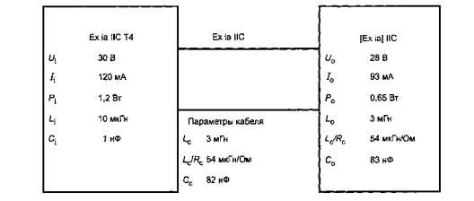 Поскольку в данном примере искробезопасные входы и выходы связанного оборудования (источник питания, индикатор и плоттер) не имеют эффективных значений индуктивности или емкости, максимальные значения емкости или индуктивности можно использовать для искробезопасного оборудования (анализатор) и для соединительных кабелей.
