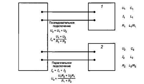 b - Последовательное подключение со сложением значений напряжения и возможным сложением значений тока