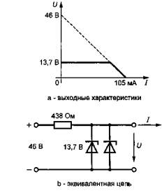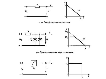 Нелинейные цепи также могут быть сведены к двум основным типам, показанным на рисунках С.1b и С.1с. Источник с трапециевидной характеристикой (рисунок С.1b, состоит из источника напряжения, сопротивления и дополнительных ограничивающих напряжение элементов (например, стабилитронов) на выходных зажимах. Ток источника с прямоугольной характеристикой, представленного на рисунке С.1с, ограничен электронным регулятором тока.