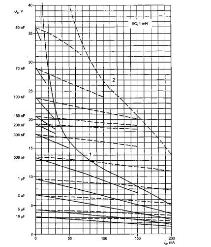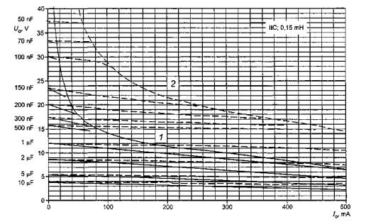 Умножить этот ток на 1,5 и, используя кривые индуктивности, приведенные в МЭК 60079-11, соответствующие данной группе оборудования, определить максимально допустимое значение индуктивности Lmах.