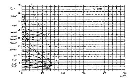 После определения новых максимальных значений тока и напряжения необходимо проверить искробезопасность комбинированной цепи с помощью кривых пределов воспламеняемости, приведенных в МЭК 60079-11 с учетом коэффициента безопасности для резистивной цепи и определить новые максимально допустимые значения внешней индуктивности L0 и емкости С0. Однако здесь обнаруживается слабое место методики, при введенной в МЭК 60079-14, приложение А, по следующим причинам: