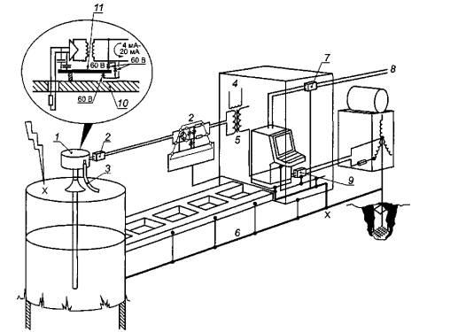 1 - преобразователь; 2 - ограничитель перенапряжений; 3 - заземляющая перемычка; 4 - сетевое питание; 5- гальванический разъединитель; 6 - эквипотенциальное соединение; 7 - подавитель сигналов; 8 - канал передачи данных; 9 - сетевой фильтр-подавитель; 10 - обшивка резервуара; 11 - корпус прибора
