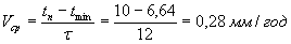 Следует отметить, что в нефтехимической и нефтеперерабатывающей промышленности существует банк данных по скорости общей коррозии [6], который используется при проектировании трубопроводов для назначения прибавки на коррозию. Этими данными можно воспользоваться и при диагностировании, принимая в пределах разброса опытных данных верхнее значение Vcp, учитывая при этом очевидное ограничение: