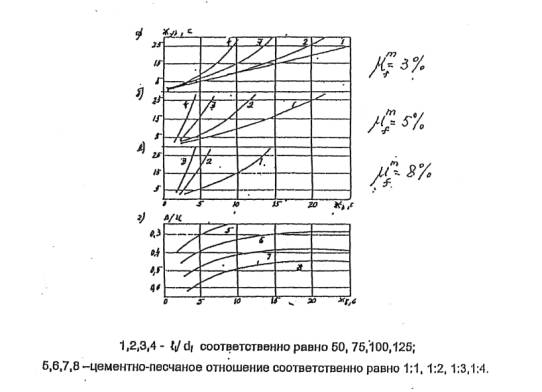 По графикам а - в (рис. 1) в зависимости от заданного значения µfm , lf /df , Жfb уточняют жесткость бетонной матрицы Жв (сек), а затем по графику «г» (рис. 1) принимают требуемые для обеспечения этой жесткости цементно-песчаное отношение и В/Ц бетона.