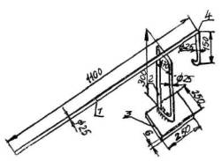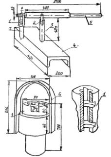 Рис. 5. Приспособление для выдергивания штырей рельс - форм: 1 - насадка; 2 - вилка; 3 - стойка; 4 - отрезок швеллера; 5 - рычаг; 6 - хомутик; 7 - штырь рельс - формы. Насадка представляет собой цилиндр с двумя продольными вырезами в стенке и двумя канавками по внутреннему диаметру. Продольные вырезы служат для направления головки штыря, а канавки по внутреннему диаметру - для поворота насадки. Каждое звено рельс - форм осторожно отделяют от бетона, постукивая кувалдой по рельсу. Нельзя забивать ломы или стальные клинья между бетоном и рельс - формой. Автокраном при помощи цанговых захватов звено рельс - форм поднимают за головку рельса и отводят в сторону, одновременно раздвигая ломом замковое соединение. Рельс - формы очищают от бетонной смеси и песка и грузят автокраном на автомобиль. На автомобиль следует укладывать не более 12 - 15 звеньев, избегая при этом механических повреждений рельс - форм. Одновременно с рельс - формами грузят штыри, предварительно собранные в ящики. Автокран и автомобиль по обочине перемещаются к месту установки рельс - форм, которые автокраном выгружают и раскладывают вдоль линии установки. Немедленно после снятия рельс - форм грани бетонного покрытия смазывают пленкообразующим материалом и присыпают песком. При установке рельс - форм следует руководствоваться следующей технической литературой: 1. «Инструкция
