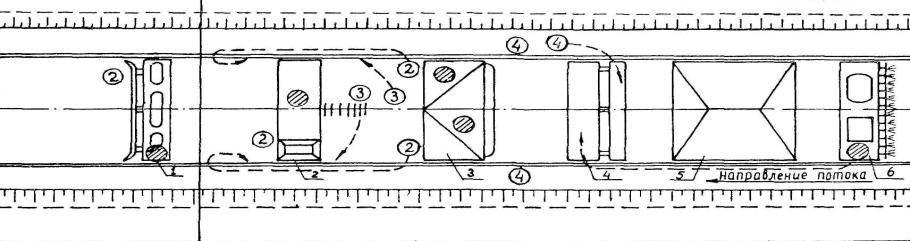 Рис. 6. Технологическая схема устройства цементобетонного покрытия: 1 - профилировщик ДС-502А (Д-345); 2 - бункерный распределитель бетона; 3 - длиннобазовая бетоноотделочная машина ДБО-7,5; 4 - нарезчик швов ДНШС-60-3М; 5 - тент; 6 - машина ЭНЦ-3 для розлива пленкообразующих материалов. Заштрихованный кружок - машинист; цифры в кружках обозначают разряд рабочих; стрелками показаны перемещения рабочих Окончательное профилирование и уплотнение Песчаный выравнивающий слой окончательно профилируют и одновременно уплотняют машиной ДС-502А (Д-345). Перед началом работы рабочие органы машины устанавливают в рабочее положение и регулируют. Профилирующий отвал с помощью двух штурвалов подъемного механизма устанавливают на проектной отметке выравнивающего слоя с припуском 5 мм на уплотнение; уплотняющий вибробрус устанавливают с помощью двух специальных винтов так, чтобы задняя кромка поддона была на проектной отметке выравнивающего слоя, а передняя - на 5 мм выше. В процессе работы необходимо следить, чтобы перед отвалом профилировщика был песчаный валик высотой 7 - 10 см. Песчаные валики, оставшиеся у рельс - форм после прохода профилировщика, зачищают заподлицо с поверхностью выравнивающего слоя. Профилировщик ДС-502А (Д-345) за один проход планирует и уплотняет песок выравнивающего слоя. Песок должен иметь оптимальную влажность, при недостаточной влажности его поливают поливомоечной машиной. Для устройства выравнивающего слоя на участках дорог, не имеющих объездов, при выгрузке бетонной смеси на основание профилировщик ДС-502А (Д-345) переоборудуют следующим образом: с одной стороны рамы устанавливают домкрат с поворотной площадкой, с другой стороны на раме, на расстоянии около 1 м от колес, укрепляют домкраты с поворотными осями, несущими на себе колесные пары. Переоборудованный профилировщик без помощи крана поднимается над рельс - формами, опираясь с одной стороны на рельс - форму через домкрат с поворотной площадкой, а с другой - на колесную пару. Затем при помощи колесной пары профилировщик разворачивают и устанавливают вдоль нитки рельс - форм, освобождая проезд по основанию автомобилей с бетонной смесью. Установка закладных элементов швов расширения В местах устройства швов расширения устанавливают деревянные прокладки со штырями и поддерживающим каркасом из арматурной стали диаметром не менее 6 мм. Штыри изолируют на ⅔ длины слоем жидкого битума толщиной не более 0,3 мм. На изолированные концы штырей надевают в шахматном порядке картонные или резиновые колпачки, заполненные на длину 3 см опилками или войлоком. Готовую прокладку, состоящую из двух частей длиной по 3,75 м, устанавливают строго перпендикулярно оси дороги и надежно закрепляют штырями через 0,8 - 1 м. Стыкующиеся концы прокладок соединяют скобами из проволоки диаметром 6 мм. Для обеспечения плотного примыкания прокладок их стыкуют по косому срезу. Зазор между прокладками в стыке не допускается, а между краем прокладки и рельс - формой не должен превышать 10 мм. Прокладки должны стоять вертикально, а штыри - горизонтально (перпендикулярно плоскости прокладок). В проектном положении штыри удерживают сварными каркасами. При устройстве паза шва в затвердевшем бетоне прокладку устанавливают так, чтобы ее верх после уплотнения бетона был ниже поверхности покрытия не более чем на 1 см.