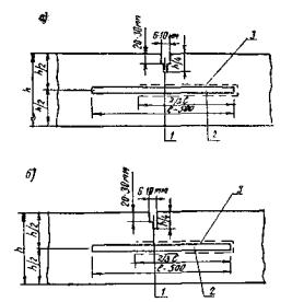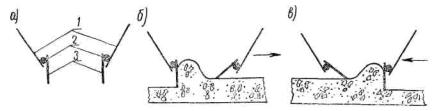 Рис. 8. Схема работы откидных щитков при разравнивании бетона, выгруженного на основание, модернизированным распределителем ДС-503А (Д-375): а - схематическая конструкция бункера; б - работа щитков при движении вправо; в - работа щитков при движении влево; 1 - стенки бункера; 2 - шарнир, соединяющий откидные щитки со стенками бункера; 3 - откидные щитки. Переоборудование бункерного распределителя может быть и несколько другим (конструкция СУ-848 треста «Киевдорстрой»). Переднюю балку рамы машины снимают, а вторую балку передней части рамы усиливают швеллером. В нижней части распределительного бункера устанавливают четыре отдельные заслонки, которые могут отклоняться под напором бетонной смеси только внутрь бункера. К передней части тележки бункера крепится на болтах кронштейн с лопастью. Для предотвращения поднятия бункера при работе на кронштейн устанавливают груз весом 150 кг. К передним секциям рамы распределителя с внутренней стороны приваривают кожухи для предотвращения попадания смеси под колеса. Базовую длину рамы машины укорачивают на 2,1 м путем вырезки средней части боковых швеллеров и уменьшают длину бункера до 1,4 м для улучшения транспортабельности машины. Модернизированный распределитель работает следующим образом: выгруженную на основание бетонную смесь распределяют лопастью по ширине будущего покрытия с постепенным перемещением смеси передней частью рамы вперед. Затем при движении машины бункером окончательно планируют бетонную смесь. При этом заслонки, открывающиеся внутрь бункера, дают возможность излишкам смеси заполнить бункер и распределить ее в местах пропусков и углублений. При устройстве двухслойного или армированного покрытия применяют два распределителя: модернизированный для устройства нижнего слоя и обычный для верхнего слоя. Смесь для нижнего слоя подают прямо на основание, а для верхнего слоя доставляют автомобилями-самосвалами по обочине и выгружают в бункер распределителя ДС-503А (Д-375). Установка штырей в швах сжатия и продольном шве Штыри для поперечных швов сжатия заготовляют из гладкой арматуры диаметром 18 мм, длиной 50 см и на ⅔ длины изолируют битумом. Крайние штыри располагают на 0,25 м от рельс - форм, а остальные - на расстоянии 1 м друг от друга. Для установки штырей применяют шаблон и вибропогружатель (рис. 9). Шаблон укладывают на поверхность бетонной смеси так, чтобы его продольная ось совпала с линией шва, обозначенной на рельс - формах. Штыри раскладывают в пазы шаблона и затем вибропогружателем погружают на проектную глубину, фиксируемую опорной плитой. С изменением толщины покрытия меняют длину вилок вибропогружателя. Штыри продольного шва заготовляют длиной 50 см из арматурной стали периодического профиля диаметром 18 мм или длиной 70 см - из гладком арматуры диаметром 16 мм. Эти штыри не изолируют битумом, их раскладывают поперек продольного шва на расстоянии 1 м друг от друга и заглубляют виброшаблоном.