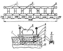 Рис. 9. Схема раскладки и погружения штырей: 1 - гнезда для штырей; 2 - метка осевой линии; 3 - поверхностный вибратор; 4 - резиновая ручка; 5 - опорная плита; 6 - шаблон для раскладки штырей; 7 - вилка вибропогружателя; 8 - штырь; 9 - свежеуложенный бетон; 10 - песчаный выравнивающий слой Уплотнение бетонной смеси и отделка поверхности Уплотнение бетонной смеси и отделку поверхности производят длиннобазовой бетоноотделочной машиной ДБО-7,5. В местах установки прокладок для швов расширения и в месте рабочего шва до подхода длиннобазовой бетоноотделочной машины ДБО-7,5 бетонную смесь уплотняют глубинным вибратором. При этом следят за тем, чтобы прокладки и штыри в процессе вибрирования смеси сохраняли проектное положение. Перед началом работы настраивают рабочие органы бетоноотделочной машины: уплотняющий брус, диагональные и поперечные вибробрусья, выглаживающий брус. При помощи двух задних гидроцилиндров устанавливают по двум шкалам заднюю кромку уплотняющего бруса на уровне поверхности бетонной смеси с учетом припуска на уплотнение. Виброорган состоит из двух диагональных и одного поперечного вибробруса. Диагональные вибробрусья устанавливают с помощью гидродомкратов на уровне головок рельс - форм. Поворотом эксцентриков подвески диагональных вибробрусьев регулируют угол атаки в пределах от 0 до 6°. После установки угла атаки вибробрусьев регулируют положение выглаживающего вибробруса при помощи винтов его подвески. Нижнюю полость выглаживающего вибробруса для бетонной смеси с осадкой конуса до 1,5 см устанавливают на одном уровне с задней кромкой уплотняющего вибробруса, для более пластичной смеси - на 2 - 3 мм ниже. Поворотом штурвала устанавливают необходимый угол атаки выглаживающего бруса и регулируют число поперечных качаний; оба параметра определяют опытным путем. Поперечный вибробрус включают в работу только у температурного шва. На расстоянии 5 м от шва поперечный вибробрус поднимают в транспортное положение. В процессе работы необходимо постоянно следить за рабочими органами и регулировать их положение. Перед диагональными выравнивающими вибробрусьями должен быть непрерывный валик бетонной смеси высотой 1 - 3 см. При нарушении этого требования проверяют правильность установки бункера машины ДС-503А (Д-375) и задней кромки уплотняющего бруса. Валик бетонной смеси перед уплотнительным брусом должен иметь высоту 8 - 10 см. При увеличении этого валика необходимо несколько опустить виброорган; если перед диагональными брусьями после этого начнет появляться излишек бетонной смеси, необходимо опустить заднюю кромку уплотняющего вибробруса и бункер машины ДС-503А (Д-375). С обеих сторон бетоноотделочной машины у рельс - форм закреплены два глубинных вибратора таким образом, чтобы уплотнять бетонную смесь у рельс - форм. Глубинные вибраторы должны быть снабжены ограничителями, исключающими заглубление вибраторов в основание. При остановке или вторичной отделке поверхности вибраторы поднимают. В тех случаях, когда укладка бетонной смеси ведется модернизированным бункерным распределителем с выгрузкой смеси прямо на основание, впереди на длиннобазовую бетонно-отделочную машину ДБО-7,5 устанавливают лопастной вал, снятый с бетоноукладочной машины ДС-504А (Д-376). Тогда перед виброуплотняющими брусьями образуется равномерный 