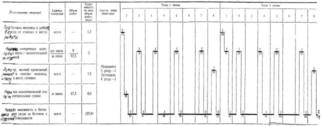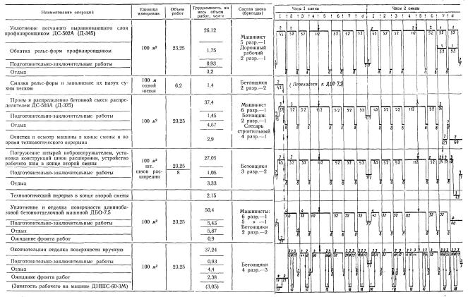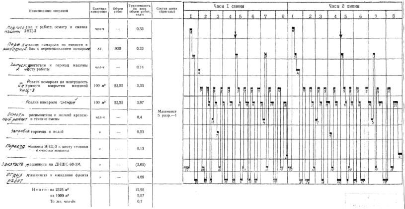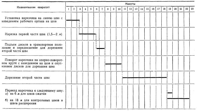 деформационных швов в цементобетонных дорожных покрытиях» 2. «Руководство по организации труда при производстве строительно-монтажных работ. Глава 28. Дорожные работы». М„ 1971. III. УКАЗАНИЯ ПО ОРГАНИЗАЦИИ ТРУДАНарезчик швов ДНШС-60-3М обслуживают машинист 5 разр. и бетонщик 4 разр., которые привлекаются к нарезке швов в свежеуложенном бетоне периодически по мере необходимости. Машинист является старшим в звене и ответственным за качество устройства и отделки швов. Во время нарезки швов он управляет машиной, наблюдает за правильной работой рабочих органов, следит за тем, чтобы лента хорошо сцеплялась с бетоном. Он заправляет ленту в прорезь вибропластины и выполняет другие операции, связанные с нарезкой швов. В начале смены машинист готовит машину к работе, а в конце смены очищает ее. Бетонщик заправляет ленту в фиксатор и придерживает его рукой при нарезке в начале шва, обрезает ленту, извлекает фиксатор, очищает его от бетонной смеси, обрабатывает поверхность покрытия у шва и в местах сопряжения. Бетонщик периодически очищает и промывает водой вибропластину и резиновую гладилку. В начале и в конце смены помогает машинисту в подготовке машины к работе, уборке рабочего места, а также нарезает рулонный полиэтилен па ленты и сращивает концы лент для продольных швов. В свободное время машинист нарезчика ДНШС-60-3М управляет машиной ЭНЦ-3 для розлива пленкообразующих материалов при уходе за бетоном, а бетонщик 4 разр. помогает бетонщикам в окончательной отделке поверхности и кромок бетонного покрытия. IV. ГРАФИК УСТРОЙСТВА КОНТРОЛЬНЫХ ШВОВ С ЭЛАСТИЧНЫМИ ПРОКЛАДКАМИ НАРЕЗЧИКОМ ДНШС-60-3М В ЦЕМЕНТОБЕТОННОМ ПОКРЫТИИ ШИРИНОЙ 7,5 м НА ДВУХ СМЕННЫХ ЗАХВАТКАХ ДЛИНОЙ 310 и (67,5 м ШВОВ)