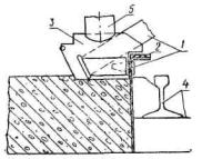Рис. 3. Подготовка основания для установки рельс - форм: 1 - штыри, выставленные по линии установки рельс - форм; 2 - подкладки под стыки рельс - форм; 3 - контрольная рейка; 4 - песчаный выравнивающий слой; 5 - цементогрунтовое основание Рядом с контрольными штырями устанавливают деревянные подкладки, пользуясь шаблоном (рис. 2). После установки подкладок на них устанавливают рейку, выравнивают песчаный подстилающий слой заподлицо с верхом подкладок и уплотняют его на ширину не менее 0,5 м (рис. 3). В случае работы бункерного распределителя ДС-503А (Д-375) с перегрузочным ковшом, следует особенно тщательно выравнивать и уплотнять песчаный выравнивающий слой под ту нитку рельс - форм, со стороны которой установлен ковш. Под стыки этой нитки необходимо укладывать уширенные деревянные подкладки.