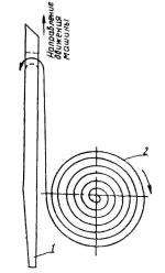 Рис. 11. Заправка полиэтиленовой ленты: 1 - вибропластина; 2 - бухта полиэтиленовой ленты. Фиксатор с заправленной лентой устанавливают вплотную с рельс - формой и нажатием руки погружают в бетон до соприкосновения нижней грани ленты с поверхностью бетона. Вибропластину подводят к фиксатору, выправляют ленту, выбирая ее слабину на бухту. Включают вибратор и погружают фиксатор и вибропластину с лентой в бетон до упора головки фиксатора в поверхность рельс - формы. Включают механизм передвижения каретки и продолжают нарезку шва. Фиксатор придерживают рукой, пока не прорежут 1,5 - 2 м шва, затем ленту у рельс - формы обрезают ножницами, конец ленты выпрямляют и поверхность бетона в зоне сопряжения отделывают гладилкой. Сопряжения прокладок с рельс - формами должны быть под углом 90°. Зазор между рельс - формой и концом лепты не должен превышать 15 мм. В конце шва при упоре вибропластины в рельс - форму муфта предельного момента срабатывает, и каретка рабочего органа останавливается. После этого выключают привод лебедки, а затем вибратор; ленту обрезают и вытягивают из прорези вибропластины крючком. Вибропластину поднимают, очищают от бетонной смеси и поворотом на 180° вокруг вертикальной оси устанавливают для нарезки следующего поперечного шва. Сопряжение ленты с рельс - формой тщательно заделывают гладилкой. Затем включают механизм передвижения машины для выхода нарезчика на линию следующего поперечного шва. При нарезке всех видов швов нарезчиком ДНШС-60-3М необходимо выполнять следующие требования: а) рабочие органы нарезчика должны быть в исправном состоянии; б) вибропластину периодически, особенно при перерывах в работе и в конце смены, нужно очищать от смеси и промывать водой, а по мере износа - заменять; в) резиновая гладилка должна быть эластичной. В процессе работы ее необходимо периодически очищать и промывать водой, а изношенную заменять новой, изготовленной из диэлектрического коврика толщиной 6 - 10 мм; г) вибратор рабочего органа должен питаться током напряжением 36 в. Работа на пониженном напряжении не допускается; д) при работе в холодную погоду полиэтиленовую ленту нужно подогревать до температуры +10°С. К качеству нарезки швов предъявляются следующие требования: а) шов должен быть прямолинейным; для этого нижнюю направляющую для передвижения рабочего органа ДНШС-60-3М опускают несколько ниже, уменьшая тем самым длину свободного конца штанги, на которой крепится рабочий орган; б) лента должна быть установлена вертикально и омоноличена бетоном на всю глубину; наплывы бетона у ленты, завал ленты в бетон, зазоры и щели между бетоном и лентой не допускаются; в) на пересечениях поперечных швов с продольными перерезают ленту продольного шва, лента поперечного шва должна быть цельной; концы ленты продольного шва должны быть уложены под прямым углом к ленте поперечного шва и соприкасаться с ней; не разрешается оставлять концы ленты загнутыми; г) поверхность бетона у шва должна быть тщательно отделана и не иметь возвышений и впадин, превышение одной кромки шва над другой не должно быть более 3 мм; д) глубина заложения полиэтиленовой ленты при устройстве поперечных швов должна быть не менее ¼ толщины покрытия (5,5 см). Лента должна выступать из шва над поверхностью бетона на 0,5 - 1 см. Дефекты в работе рабочего органа нарезчика и способы