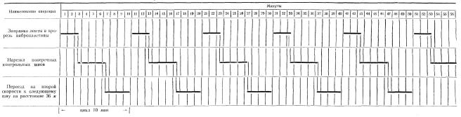 Итого: на две захватки 2325 м2 6,1 на 1000 м2 2,62 (0,33 чел-дн) Примечание. Цифра над линией - количество рабочих, занятых в операции. Цифра под, линией - продолжительность операции, мин. IV. ЦИКЛОГРАММА НАРЕЗКИ ПОПЕРЕЧНЫХ ШВОВ НАРЕЗЧИКОМ ДНШС-60-3м